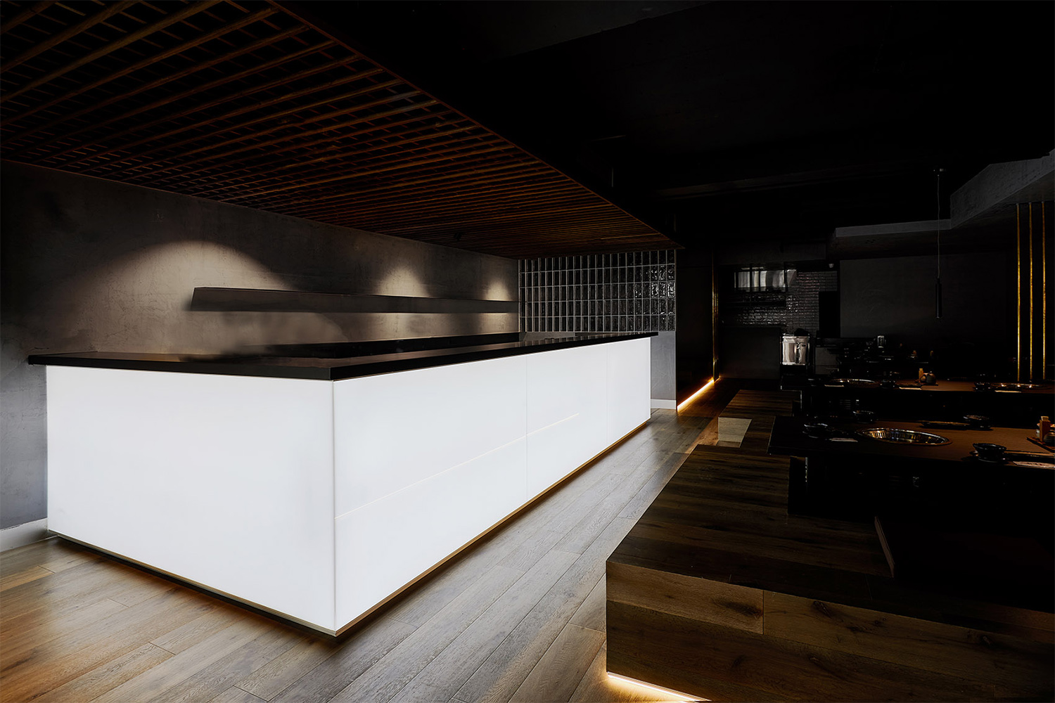 以白光照亮的吧臺與木板條制造的天花板構成了整個空間的核心部分。實心的玻璃磚被用于分隔空間。抬高的用餐區以深色木地板鋪設,與懸掛在餐桌上方的燈共同營造出別具一格的用餐體驗。在這里,美食是絕對的主角,精心烹制的優質肉類與蔬菜構成了餐廳體驗的一部分。