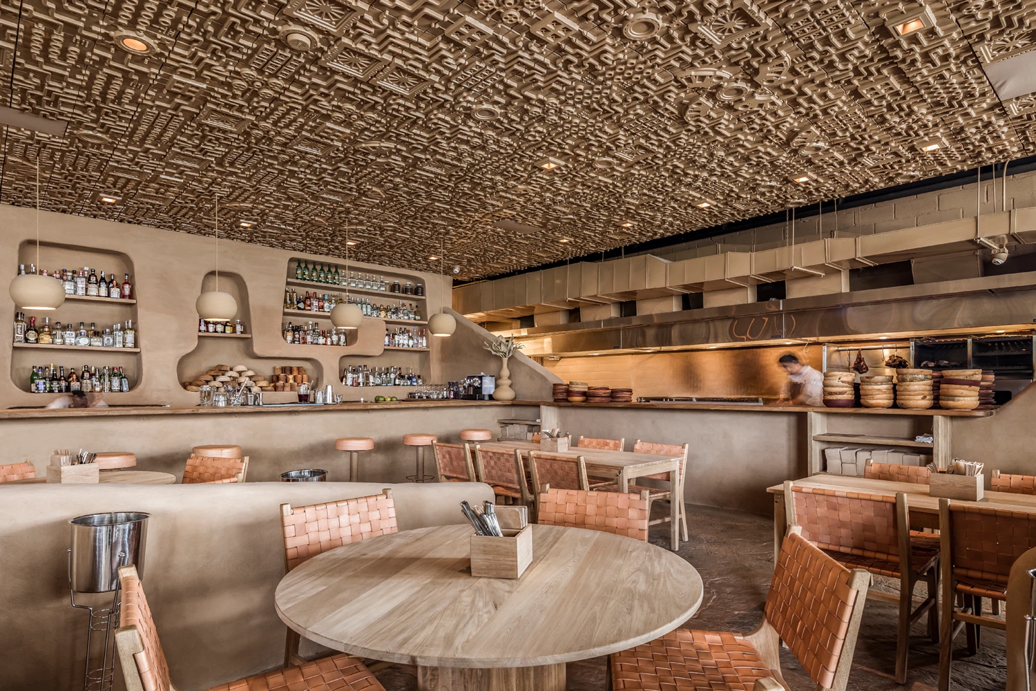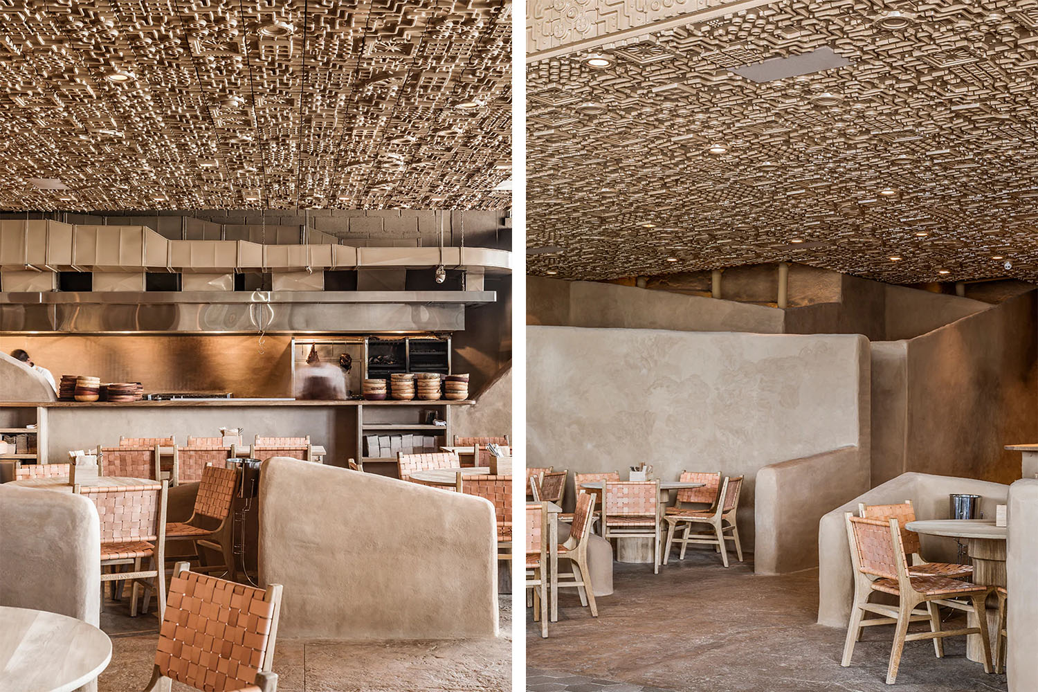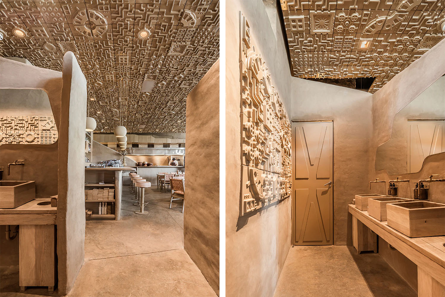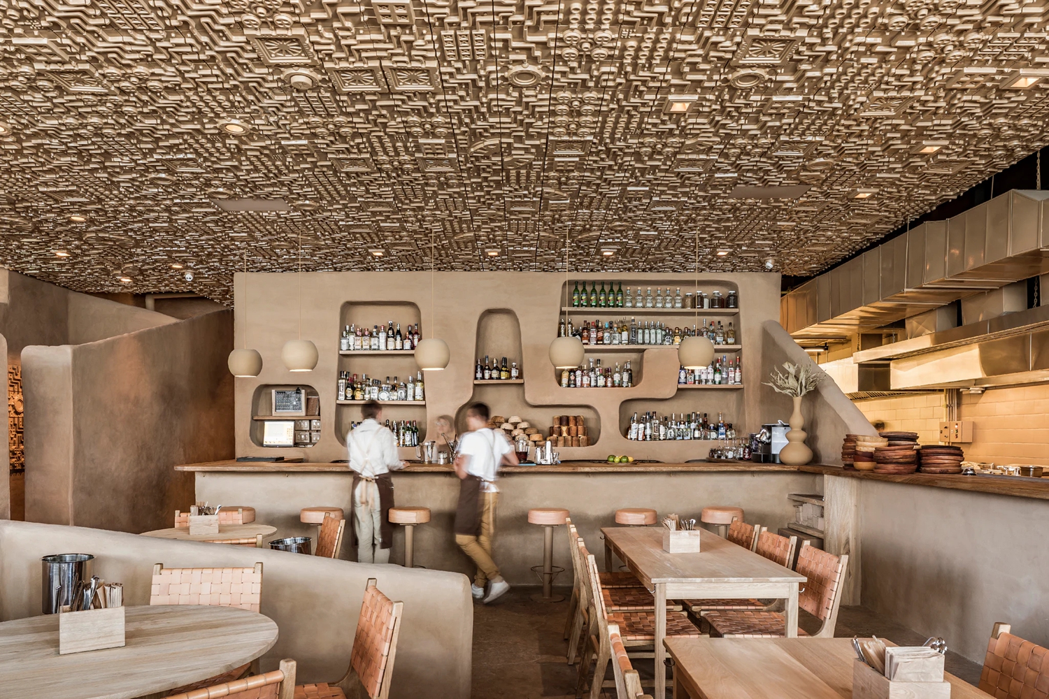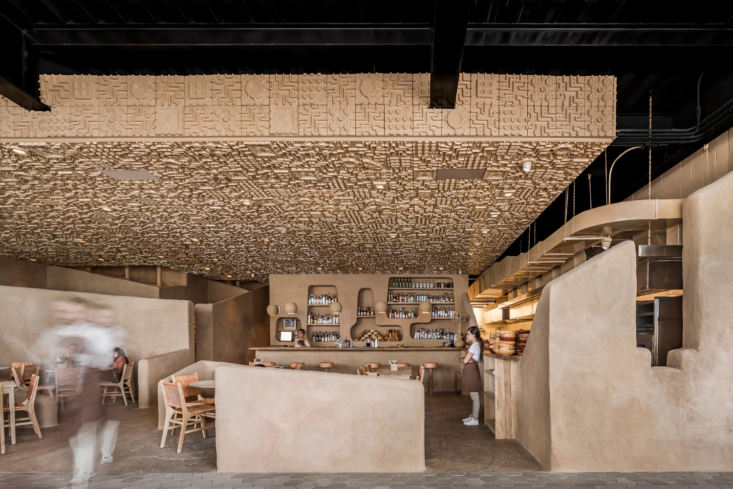 他們設置了一系列不同高度的“從地面升起”的光滑矮墻作為隔斷,它們給人一種侵略的美感。烹飪區是整個項目的核心,設計師通過石頭爐和坑式烤箱向傳統的柴火烹飪方法致敬。這個區域對所有人開放,一系列內凹的展示架讓人聯想到原始人居住的洞穴。與之形成對比的是向外凸出的浮雕天花板,天花板通過相同的色調與周圍環境相呼應。
