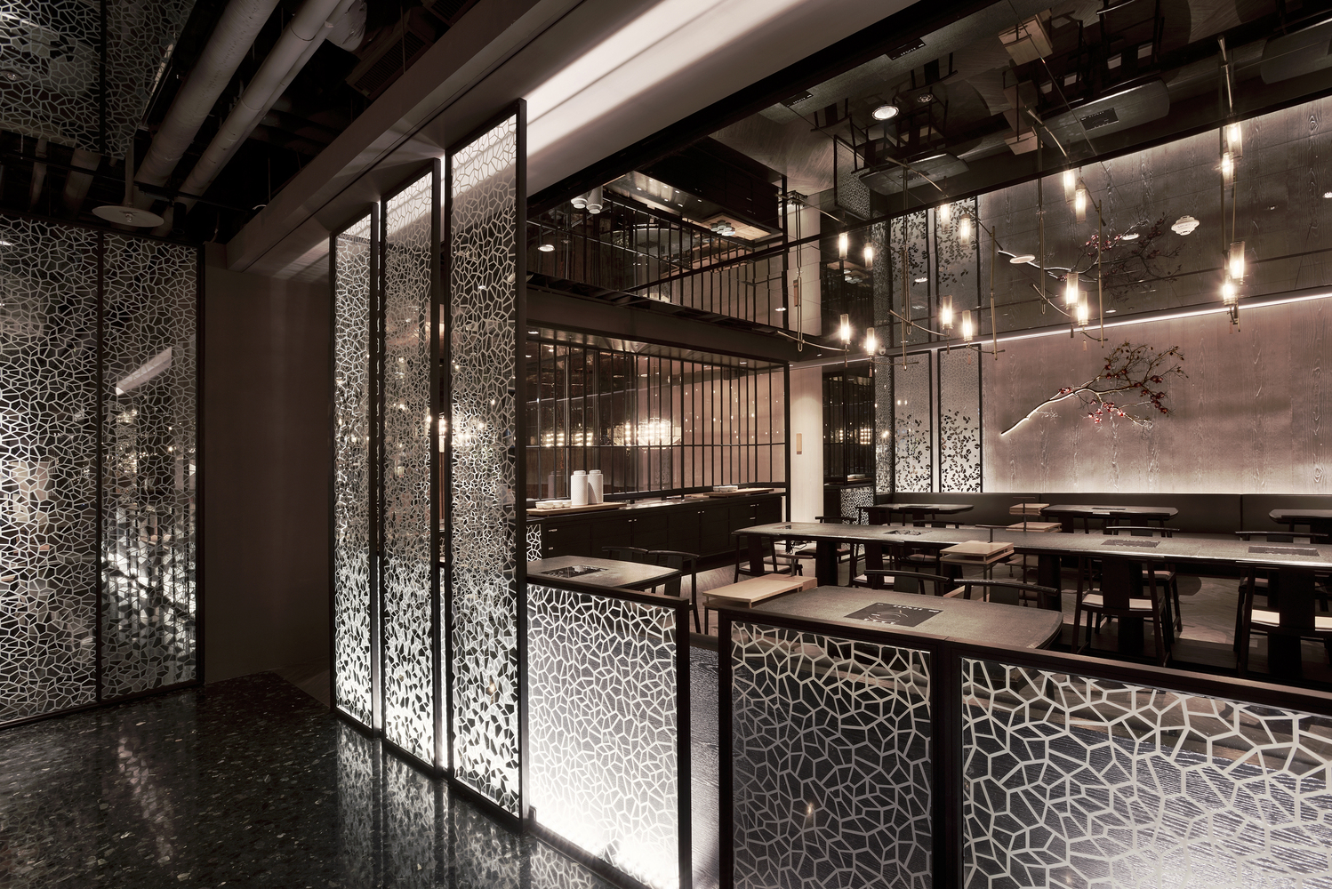 全區以黑玻璃鏡面的反射延伸效果,拉深天花挑高尺度,墨染般的天花又因光線均勻的飾點,加上鏡面制造去邊界化效果,而綠色深邃的石頭地板,不規則篆刻般的灰階點墨,讓整體空間,如潛行中的明光暗火,好讓一群人雜沓行走于漫漫長路上有所指引,也使得在空間中繚繞的眾味喧嘩,隨行依搭著光火般的淋漓,讓饌食時刻間或澆灌以神圣。