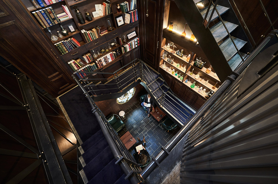 建物后區(qū)刻意地挑高,并設計一環(huán)繞挑空區(qū)的大型金屬樓梯,讓人們沿著墻面行走向外望去可完整欣賞到舊建筑物內(nèi)整體分明的錯層關系;轉(zhuǎn)角鏡面設計將視覺無限延伸模糊了虛實空間的界線…站在臺階上享受整體不論是垂直空間或水平錯層交織下所帶來一言難盡的驚喜與趣味。