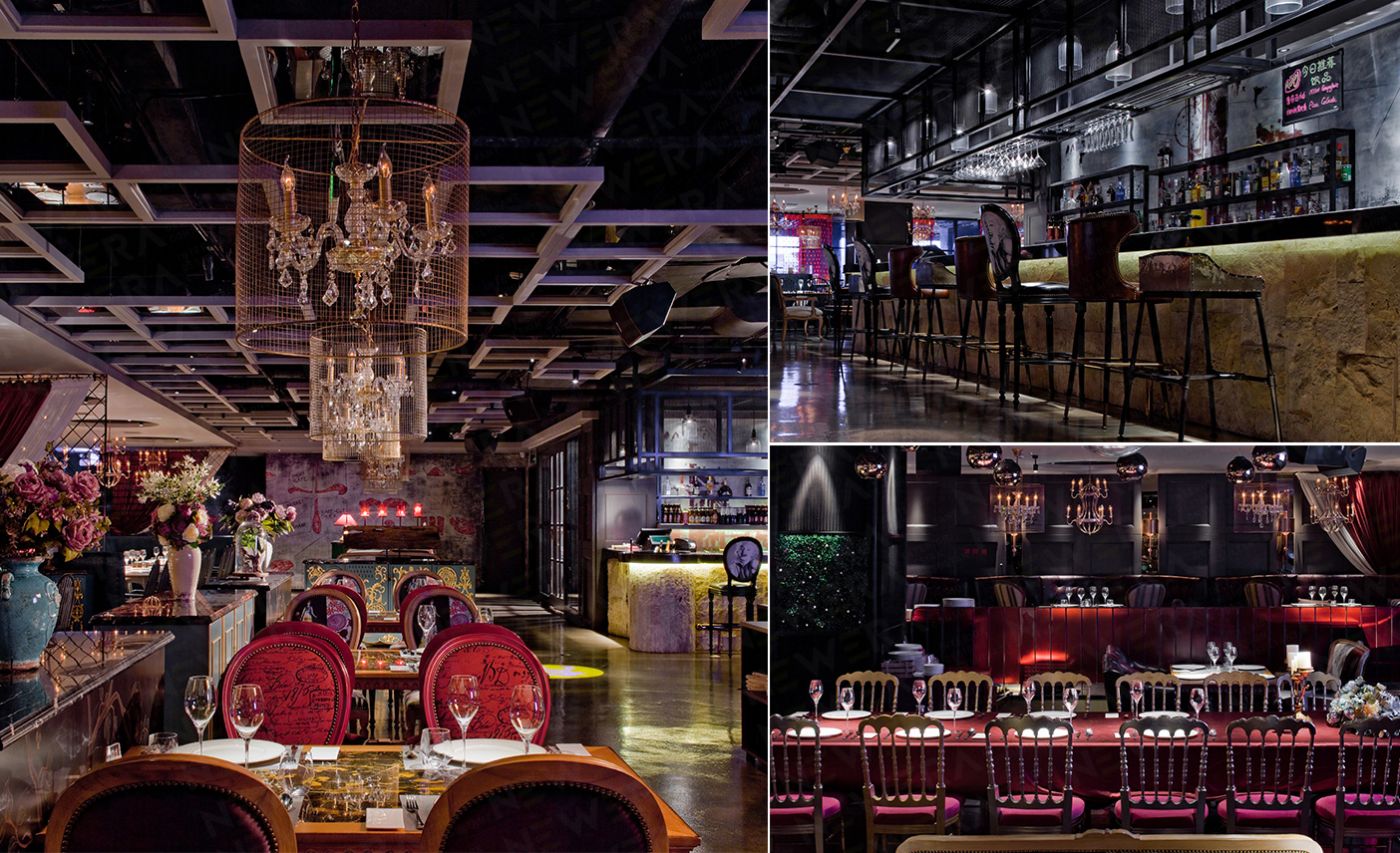 4℃扒房堅執對美味的極致熱愛,設計師為了突出其食材和味覺享受,在大廳就餐區采用了深色為主色調,搭配紅色天鵝絨窗簾、歐式吊燈和復古五斗柜,營造出低調高級的就餐氛圍。