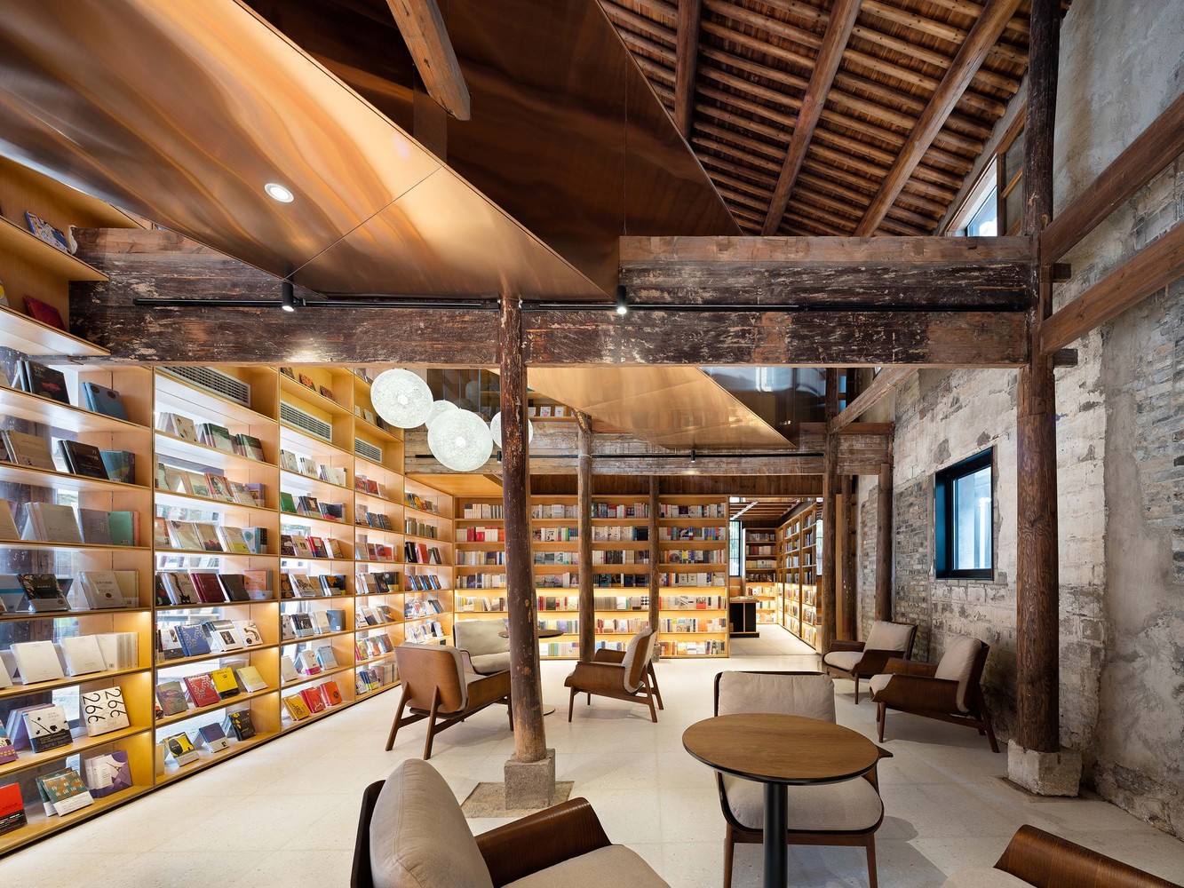 面對不同年代的老建筑,保留其現有的外觀并采用為其“量身打造”的改造策略。對于100年歷史的四合院,修舊如舊,盡可能的還原屬于歷史院落的生氣,在細節上保留曾經的“當鋪記憶”,再為其注入新的生命力;對于60年歷史的兩幢工業遺存建筑,保留一部分歷史和工業痕跡,在整體建筑修繕的同時,通過局部加入當代空間感受和空間使用方式,產生一種戲劇化的空間對話。