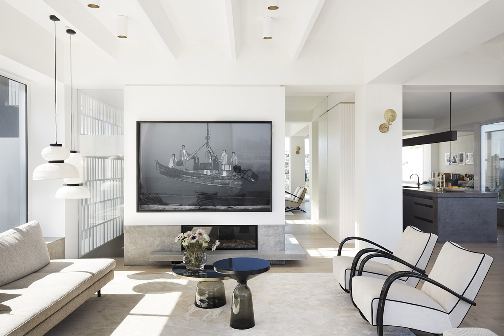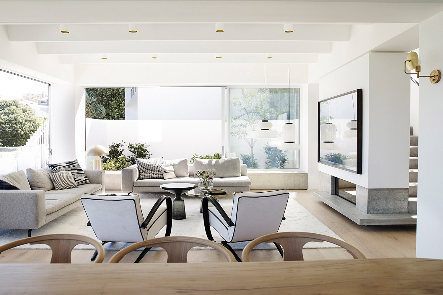 設計師保留建筑結構中的梁和柱,將住宅內部掏空,移除室內大部分墻壁,并在面向庭院的立設置巨大開窗,使房間內部享受充足的陽光。移除墻壁的最大問題在于藝術品不能靠墻而掛,因此設計師的主要任務是將藝術帶回到居住生活里。