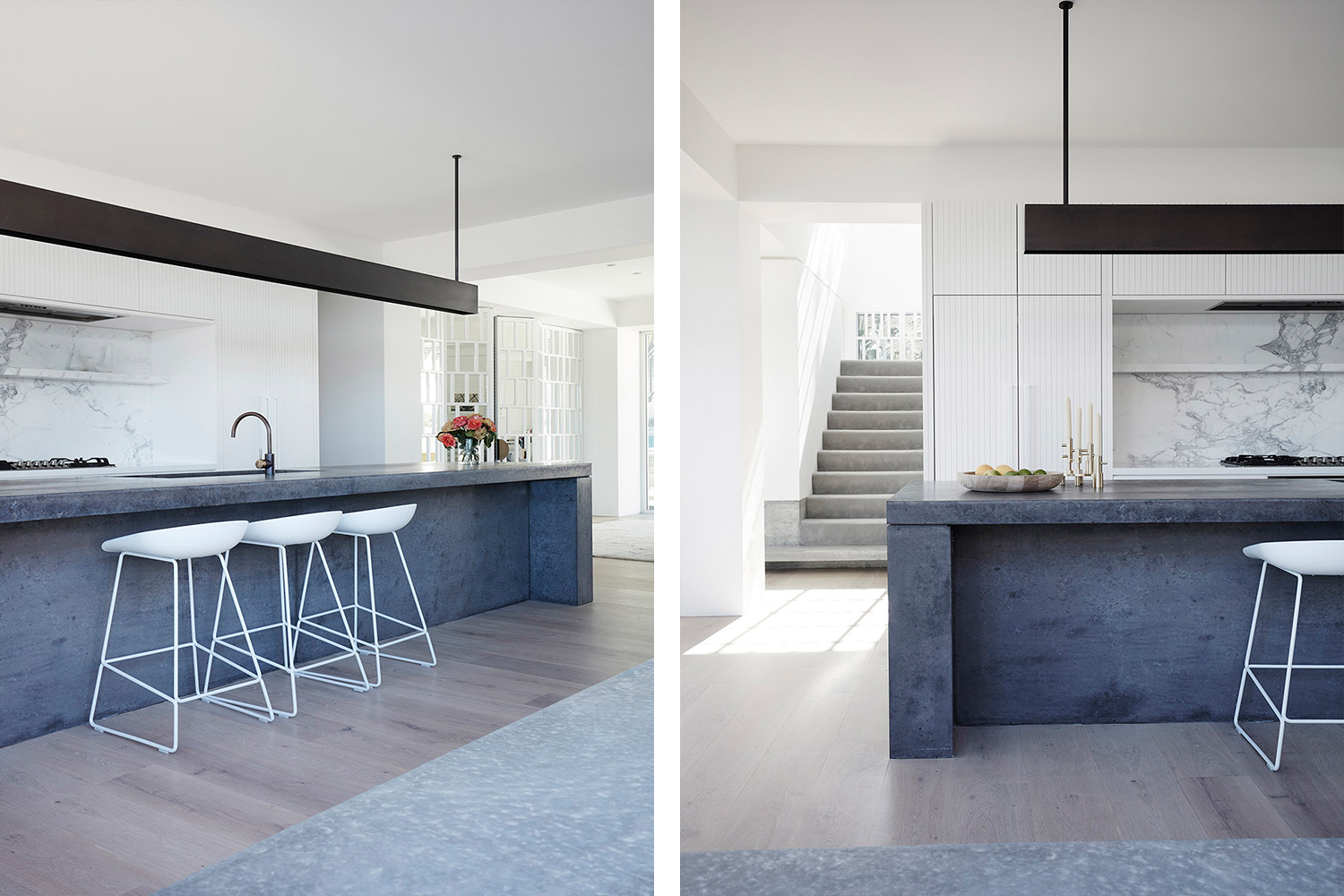 海景住宅的所有者是一戶五口之家,位于澳大利亞。他們熱愛藝術,極具創造力,希望擁有一間充滿陽光的住宅。設計師將住宅設計為古怪,平靜,充滿想象力,又極具個性化的居住環境。住宅基地陡峭,從街道望去,僅有現存的正立面墻壁和車庫可以顯現,因此,項目只能對建筑外貌進行細微的改變。