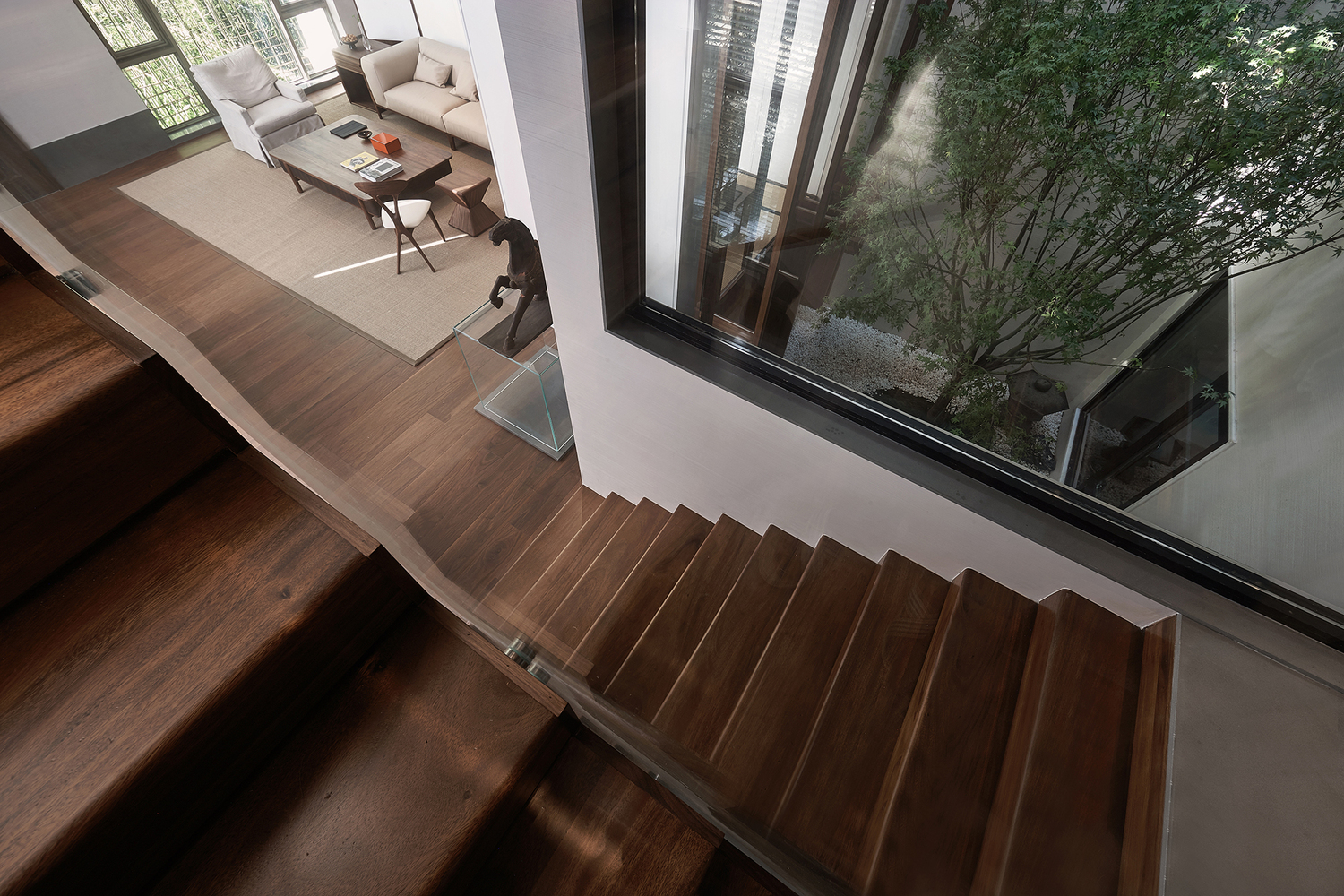 整條樓梯以北美胡桃木拼接,讓原本多層的樓梯分隔開左右兩邊的空間,少了幾分硬度,多了幾分溫度,邊界模糊化,讓整個上下樓層有了情感的鏈接。