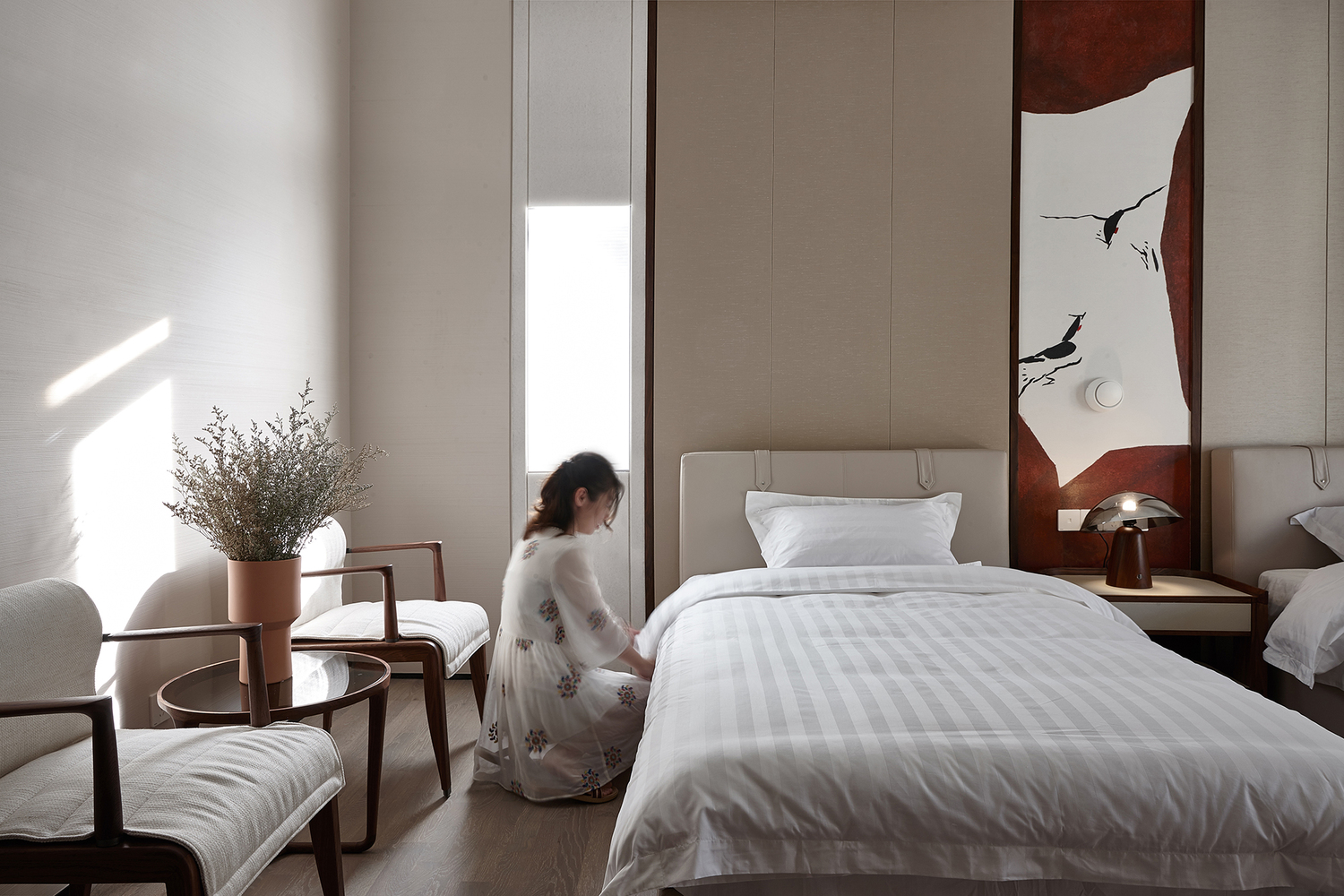 空間主材:胡桃木地板、胡桃木飾面、鋼化玻璃、肌理漆