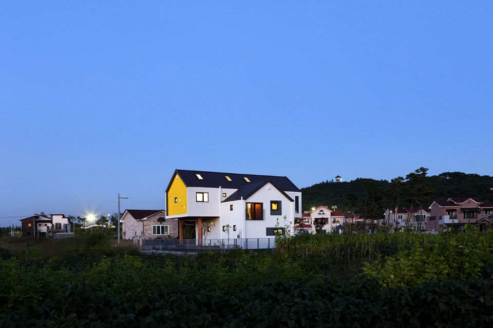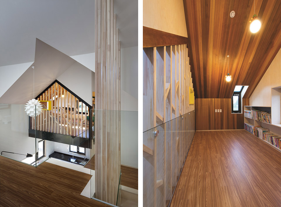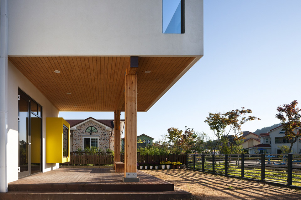 這棟全木結構的T形住宅位于韓國益山州市,T字兩端頭被挑起,分別形成入戶門廊和聯系客廳和花園的休閑平臺。一層為開放的大空間,容納了起居室,餐廳,廚房。二層則是私密空間,有臥室,書房,游戲室等房間。采用30厘米厚的膠合木實現整體輕木結構。