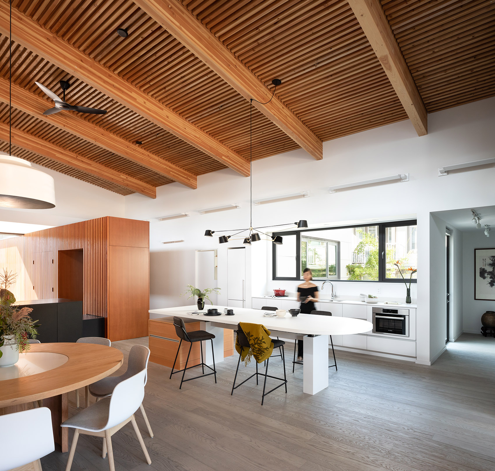 建筑師希望通過雙層通高空間中的釘子層壓木板天花板、自動控制的天窗和俯瞰著后花園的落地雙扇玻璃門將中央空間與室外環境聯系起來。入口采用雪松木飾面,巖石花園創造出一種流動感,迎接著每一位歸家的住戶和遠道而來的友人。兩側的私人生活空間通過不同的飾面在體量上加以區分,實墻與保溫隔熱的玻璃系統無縫轉換,交替出現。