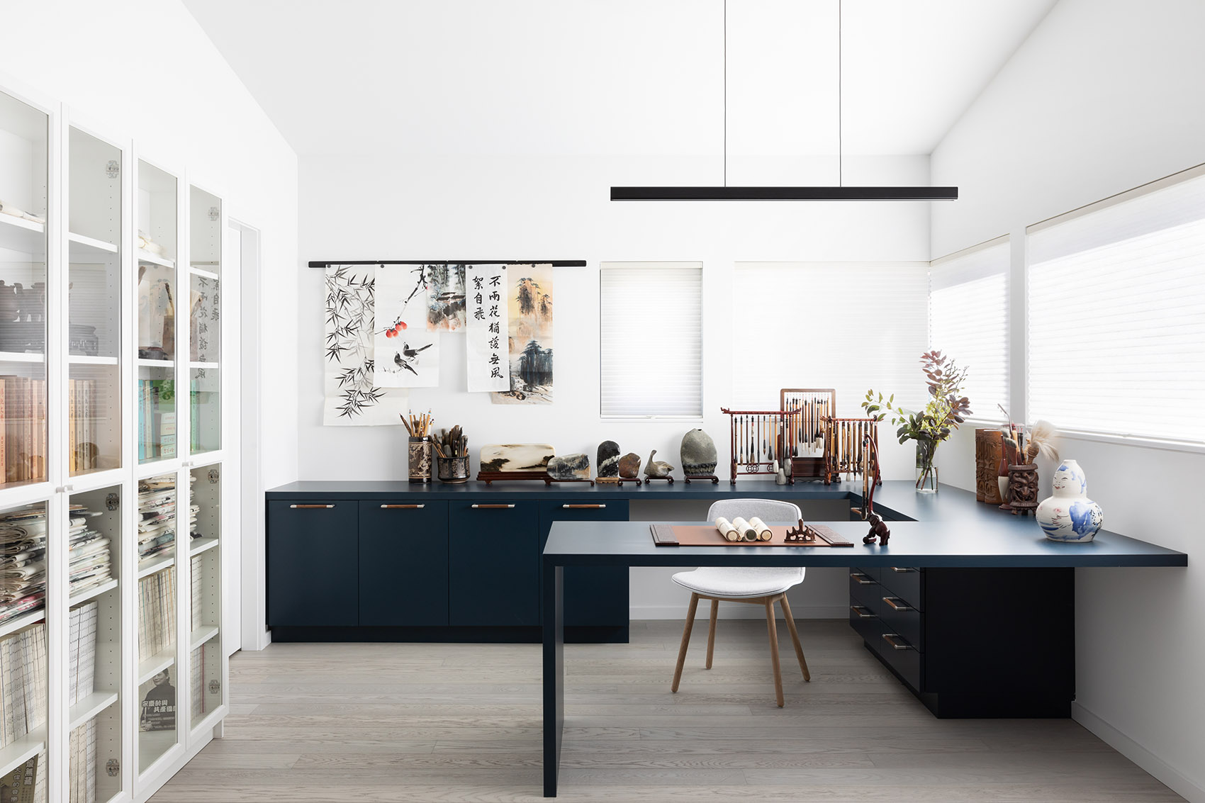 住宅在布局上有意地暗示了風水和四合院這一延續了2000多年的建筑類型。從布局上看,住宅就像是一個四面環繞著建筑體量的有頂庭院,空間序列也體現著傳統四合院的層次和秩序;住宅的前廳與生活空間分隔開來,位于基地的南側,當有客人造訪的時候,主人便可以根據與他們的親密度來決定將他們引到哪個空間里去:若只是泛泛之交,則就在前廳交談;若是推心置腹的好友,則邀請他們入內,在公共生活空間內敘舊。再向北走,便是住戶的私人生活空間了。