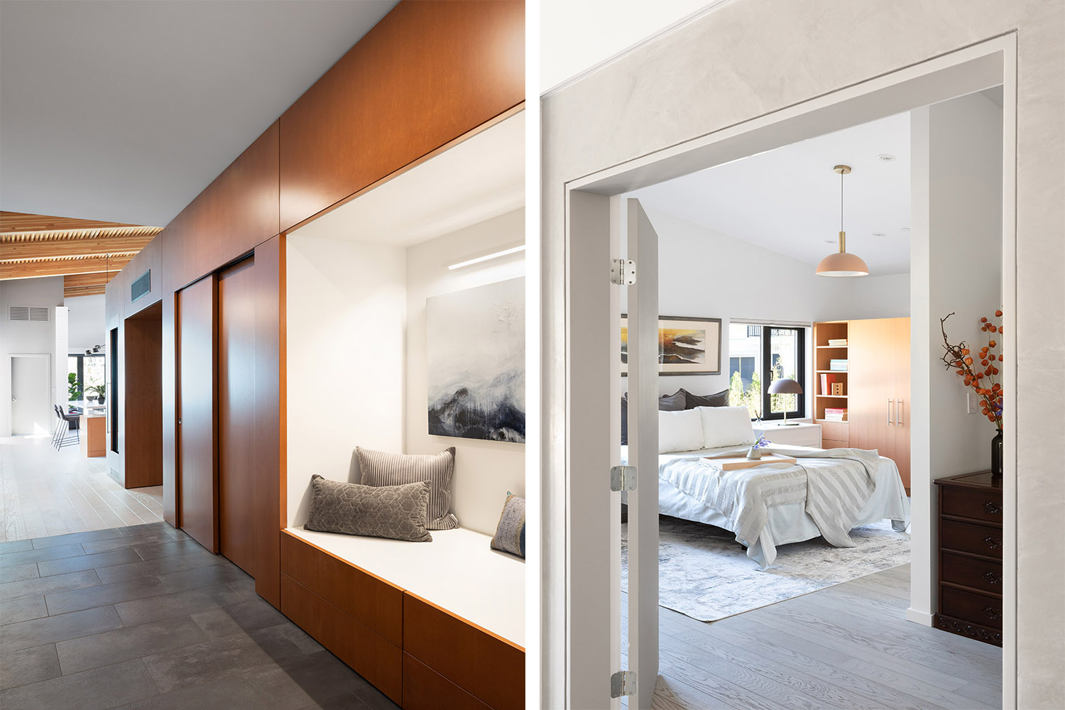住宅正面的車庫采用一個24英尺寬的頂部雙折門,該門體選擇全高度的道格拉斯冷杉木作為覆層,與住宅前廳無縫連接,由此隱藏在木飾面下的車庫門便成為了住宅的第二個立面,激發了人們入內一探究竟的好奇心。