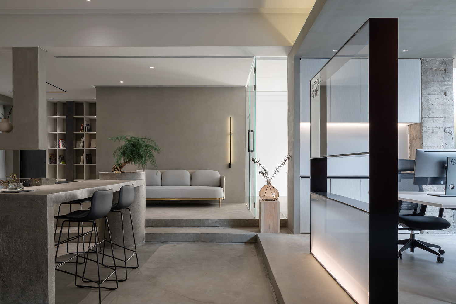 空間主材:混凝土自流平、水泥漆、夯土肌理涂料、長虹玻璃、霧面玻璃、白色乳膠漆