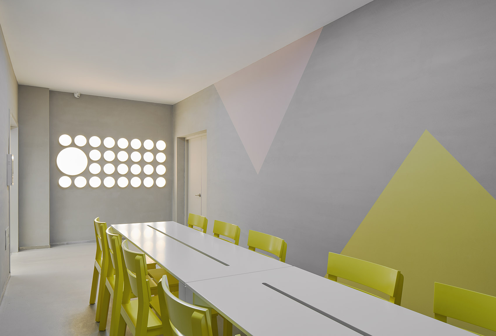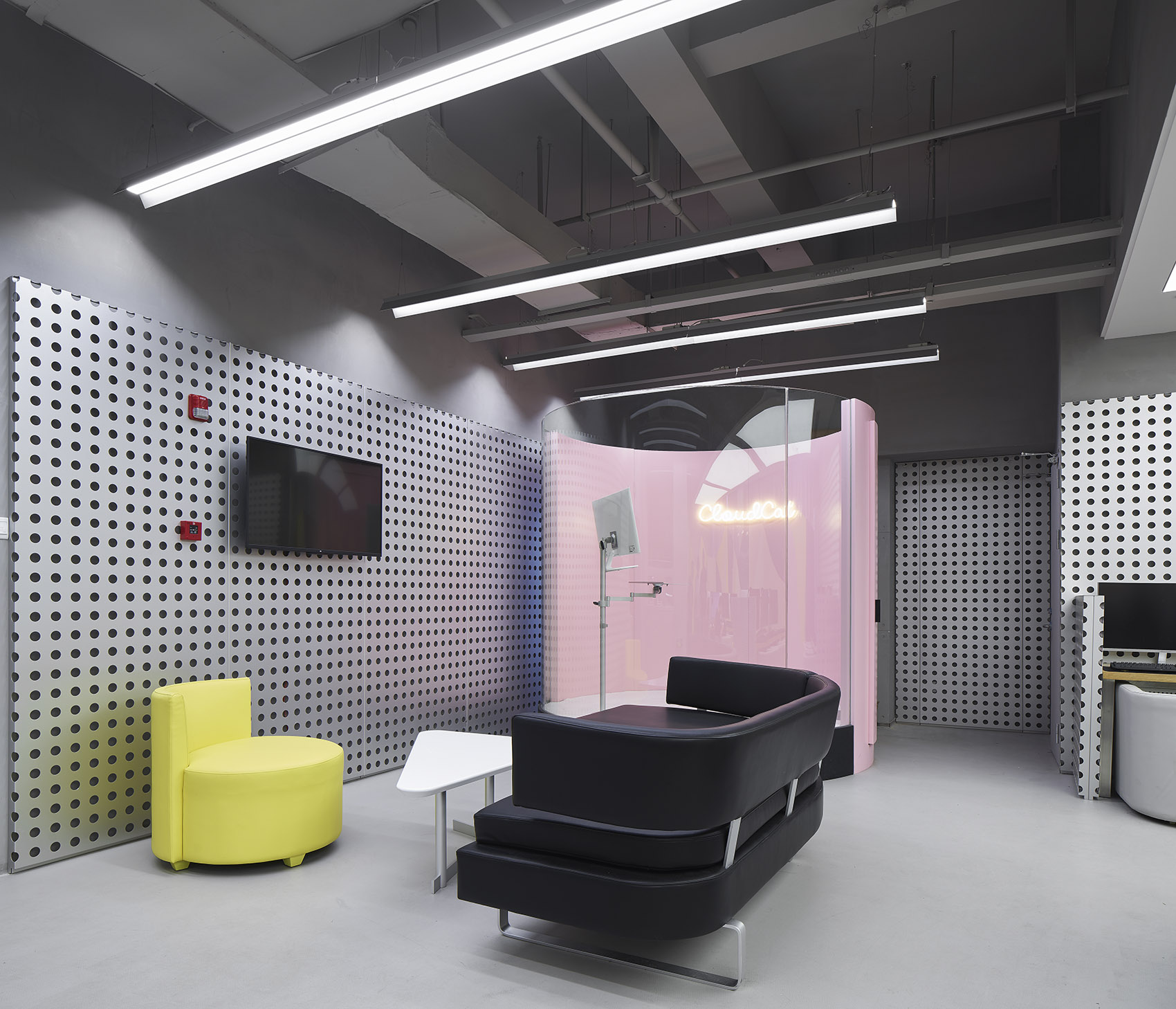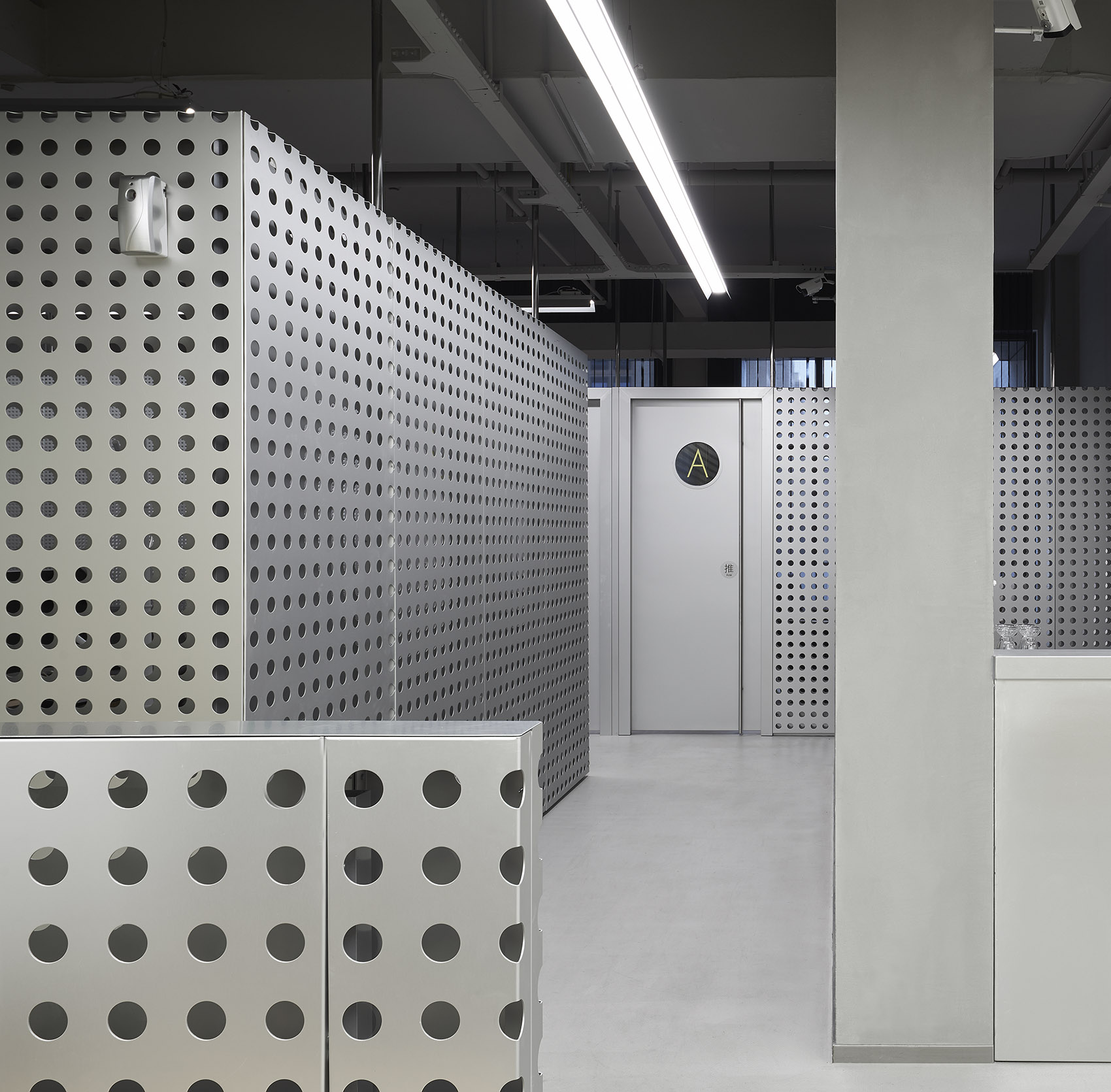 理性的鋁合金、散熱板,成為創(chuàng)意的來源,在空間里制造一種穿越與混合,表達來自科技的復(fù)古時尚。四種不同直徑的圓孔附著在陽極氧化鋁板上相互干擾,使得光線于其中產(chǎn)生不同的速率。全金屬外殼的走廊空間,因此變化出靜態(tài)下的動態(tài)。