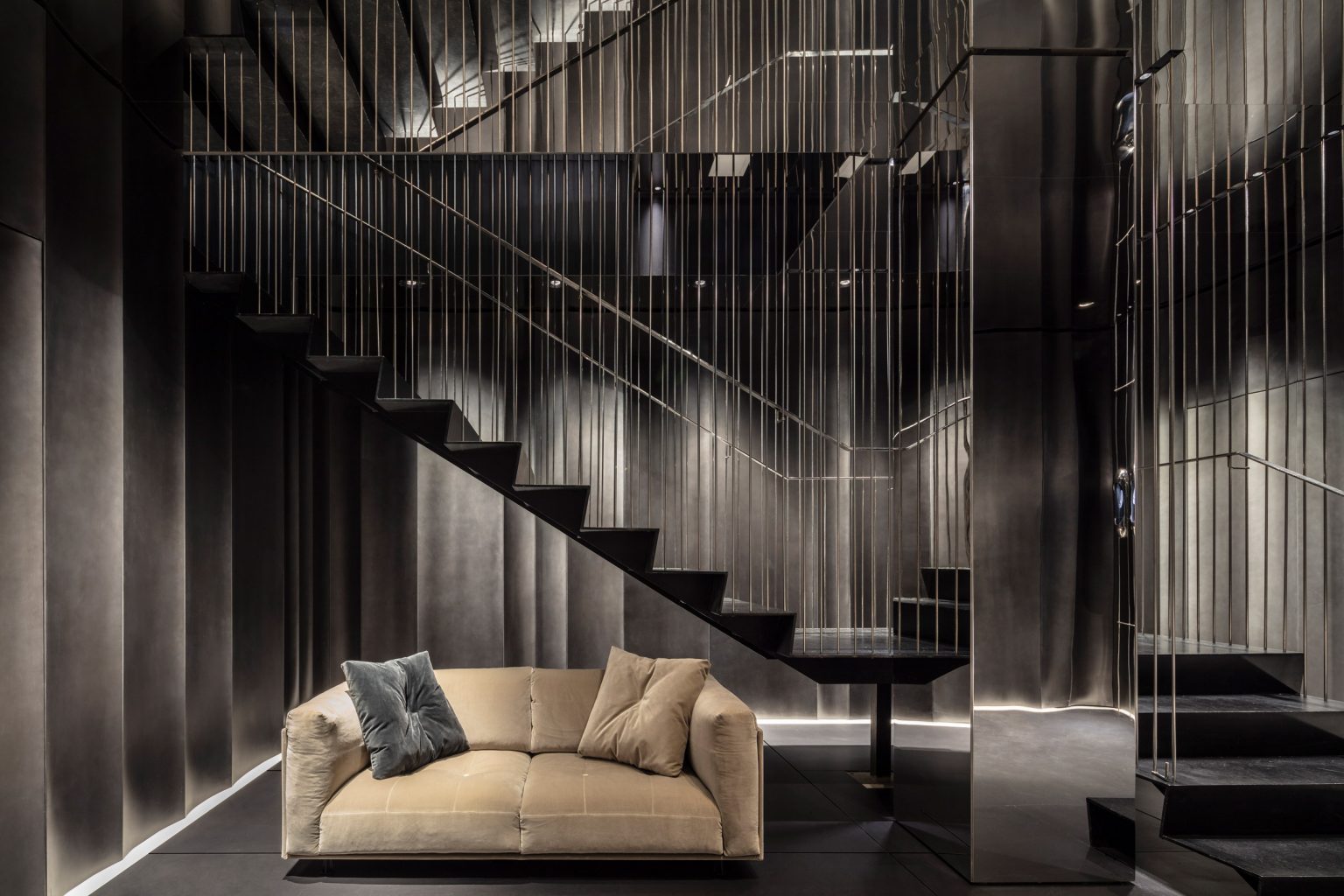 在商店主要零售空間的下方,地下室設有一個休息區,上面鋪著Living Divani的沙色椅子和沙發,與原本黑暗的空間形成鮮明對比。帶有黑色桿欄桿的工業樓梯環繞著反射柱。墻壁上還裝有特拉維夫工作室RTLD的藍色燈具。辦公室,儲藏室,小廚房和洗手間也位于較低樓層。