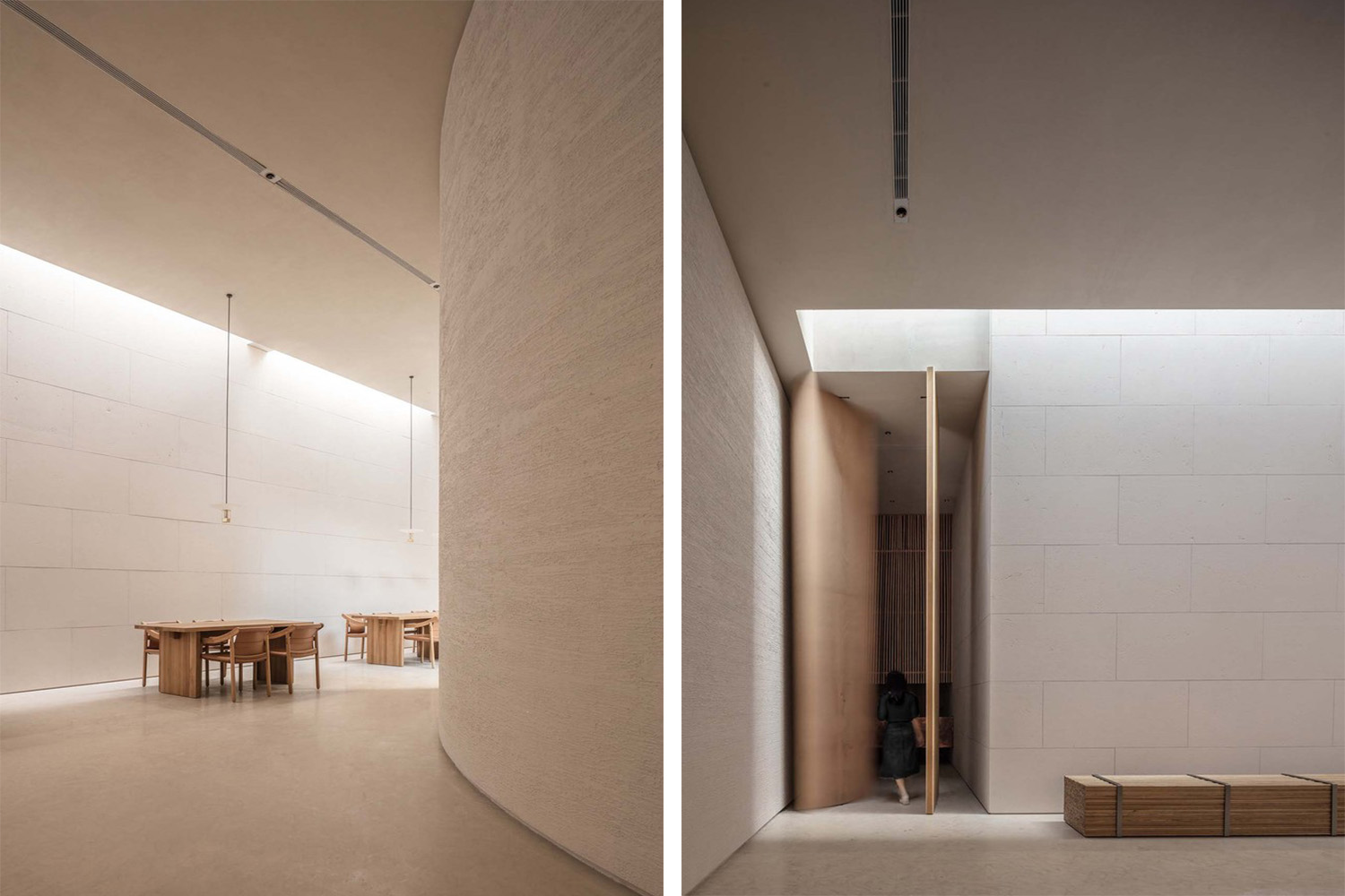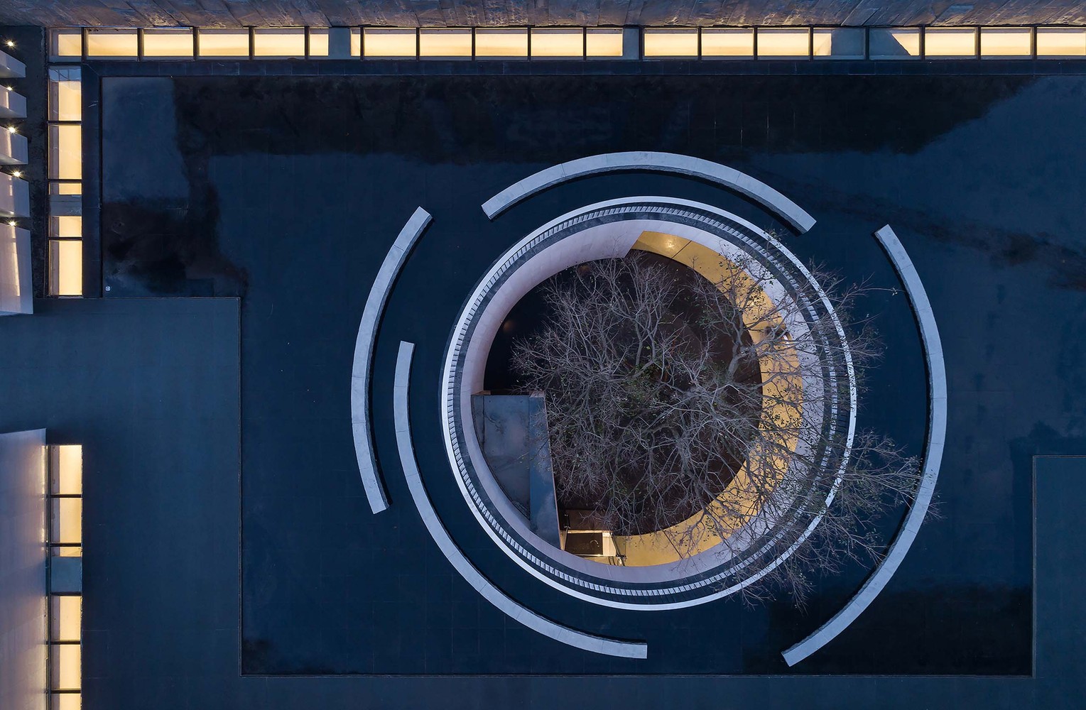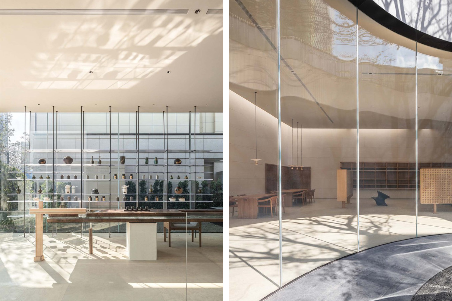 一座湖泊環(huán)繞映襯天光的玻璃茶庭是序曲,如透明容器裝載著茶席上的儀式行為,外在川流的喧囂對(duì)應(yīng)內(nèi)部不疾不徐的寧?kù)o,沈淀人們踏入后的心境。茶亭中央橫過(guò)一道流水長(zhǎng)桌穿透玻璃帷幕,于桌邊烹茶品茗時(shí)水聲不斷潺潺流入湖泊,沖出一室韻味舒展。雖非重現(xiàn)王羲之流水以泛酒的曲水流觴,但清流激湍、映帶左右的雅趣亦不遠(yuǎn)矣。