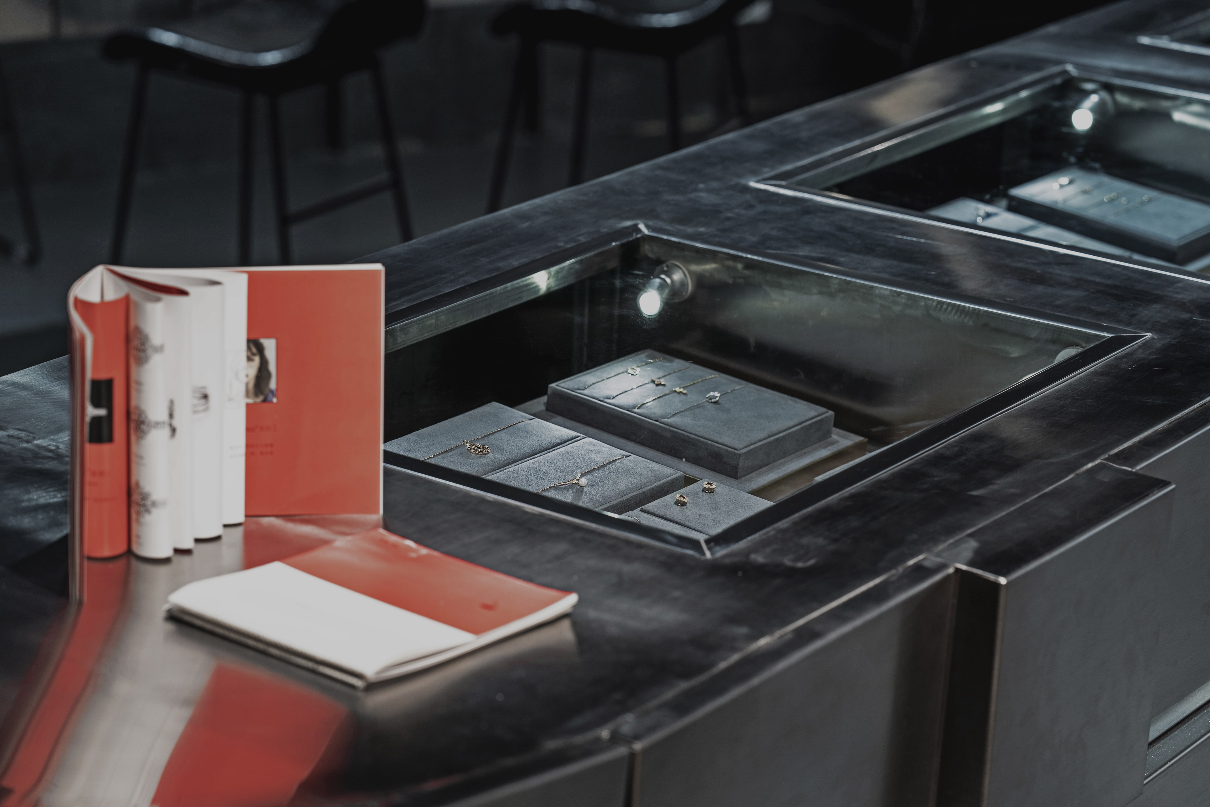 項目位于蘇州工業園區月廊街8號(誠品書店)1樓L114室,這是一個開敞的店面,進深6m,面寬9.4m,總面積約60㎡。現狀天花深黑色并布有較多的設備管道。珠寶屬于目的性消費,在傳統封閉式高奢店面的設計場景中,普通顧客在沒有特殊購買需求的情況下只會櫥窗購物,而不會進入珠寶店進行體驗和試戴。我們希望通過店面設計帶動更多非目標群體進入店面中體驗珠寶產品,引發購物的欲望,讓珠寶成為日常生活中的必需品。
