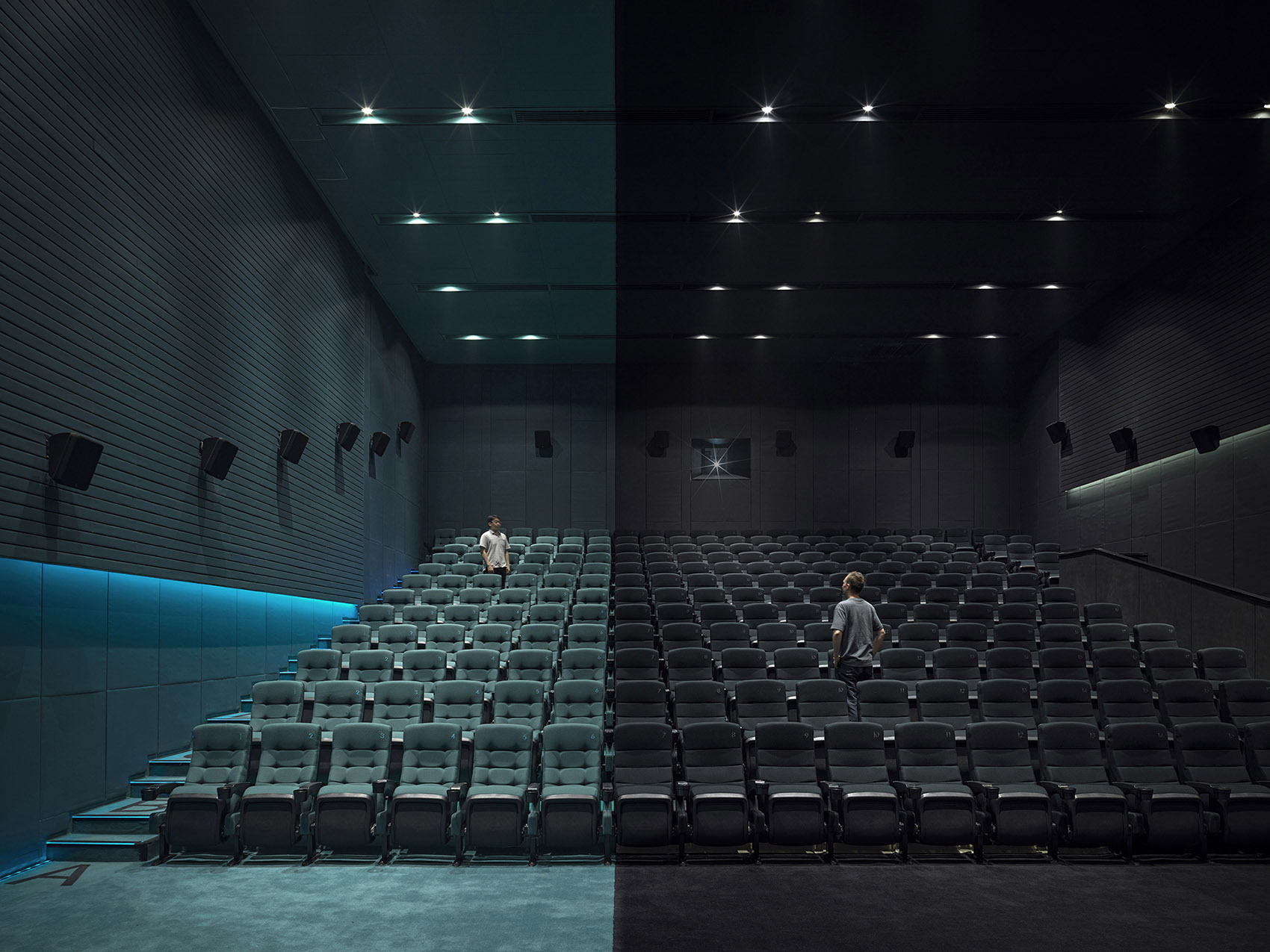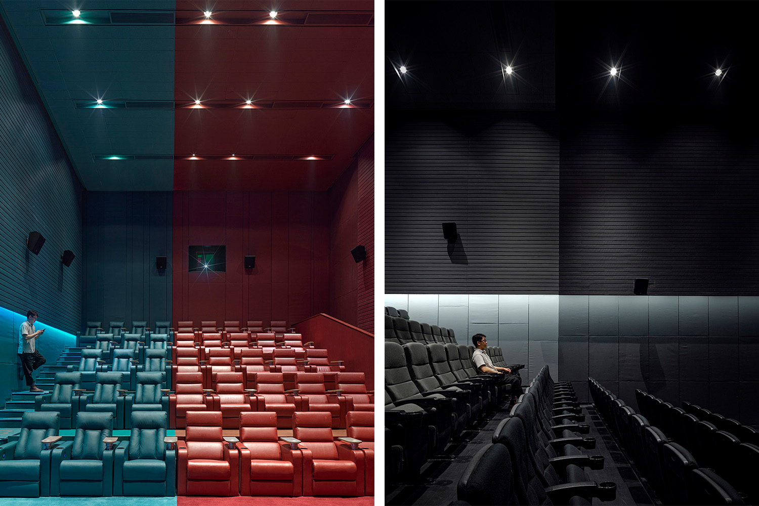 影廳之中,采用不同的兩種顏色將影廳空間分割開來,兩種顏色在一個空間中的沖突,涇渭分明的行成一體,一道光線將空間割裂開來。青色和紅色是負(fù)片上色彩的互補色。影城內(nèi)顏色的搭配也結(jié)合了“負(fù)片”的主題概念,在新項目中,嘗試更多創(chuàng)新的顏色搭配。參考傳統(tǒng)膠卷負(fù)片的色彩,卻又突破影院常規(guī)的顏色搭配。
