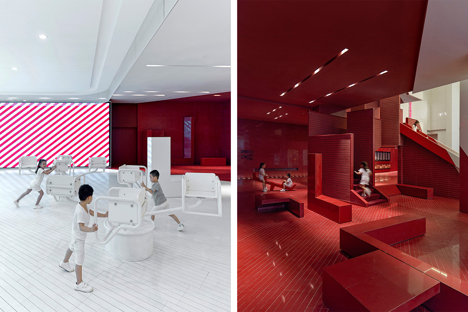 我們考慮到現(xiàn)在很多親子,或者年輕人會結(jié)伴去看電影,他們都希望電影會給他們帶去快樂的體驗,于是在設(shè)計之初,我們考慮一些獨特的游玩主題。我們在大堂設(shè)計了一部大型的滑梯,并且將滑梯的設(shè)計融入到整個設(shè)計概念之中,從紅和白色的分割,以及造型的表現(xiàn)。我們希望給觀眾帶去一種全新的娛樂感受和游樂氛圍,區(qū)別與其它影院項目,即使并不是真的會去滑,而是看到這樣一個設(shè)計,看人一看到就會覺得有趣,亦或者爬上滑梯,一滑而下,享受片刻的童真樂趣,也是給人帶去歡樂的氣氛。