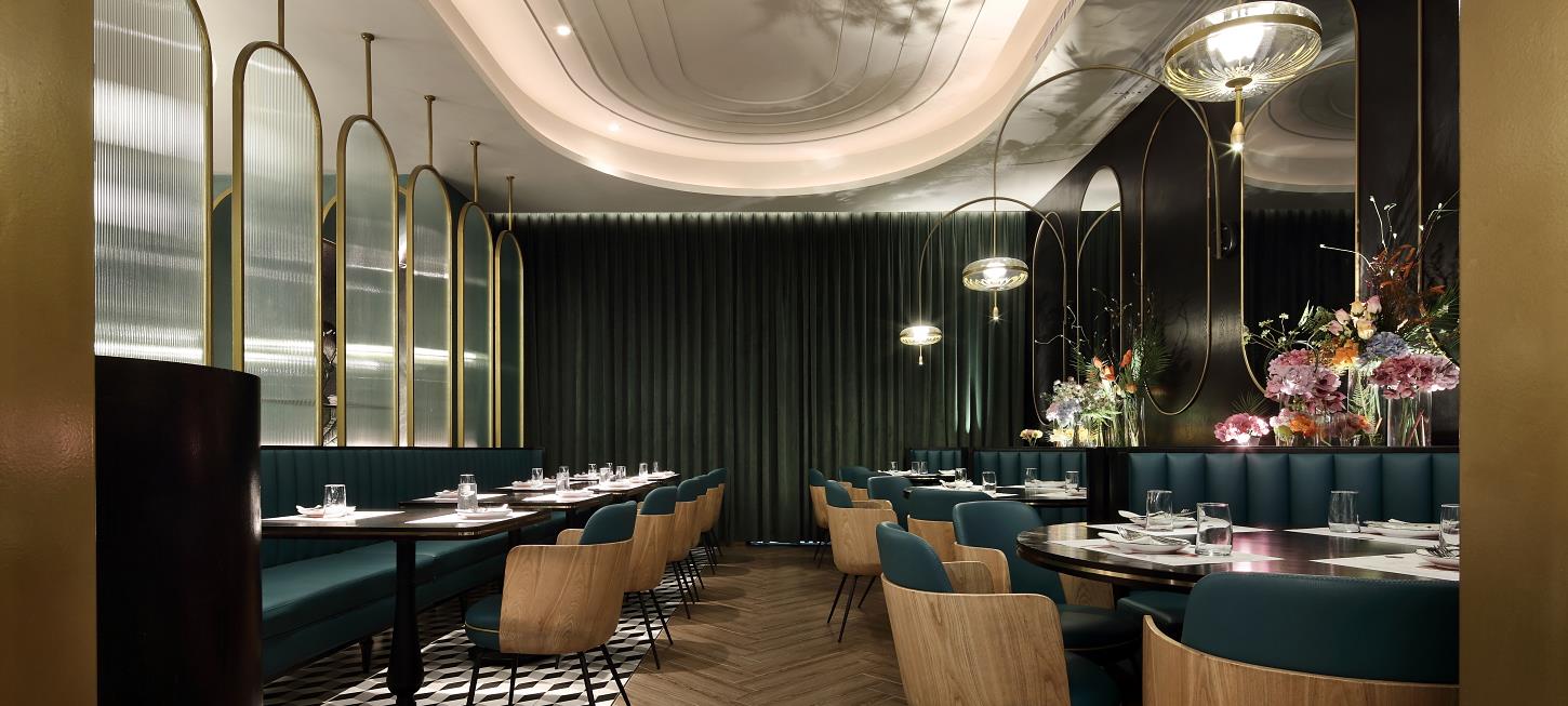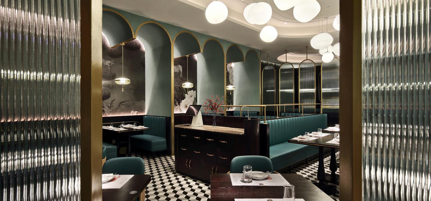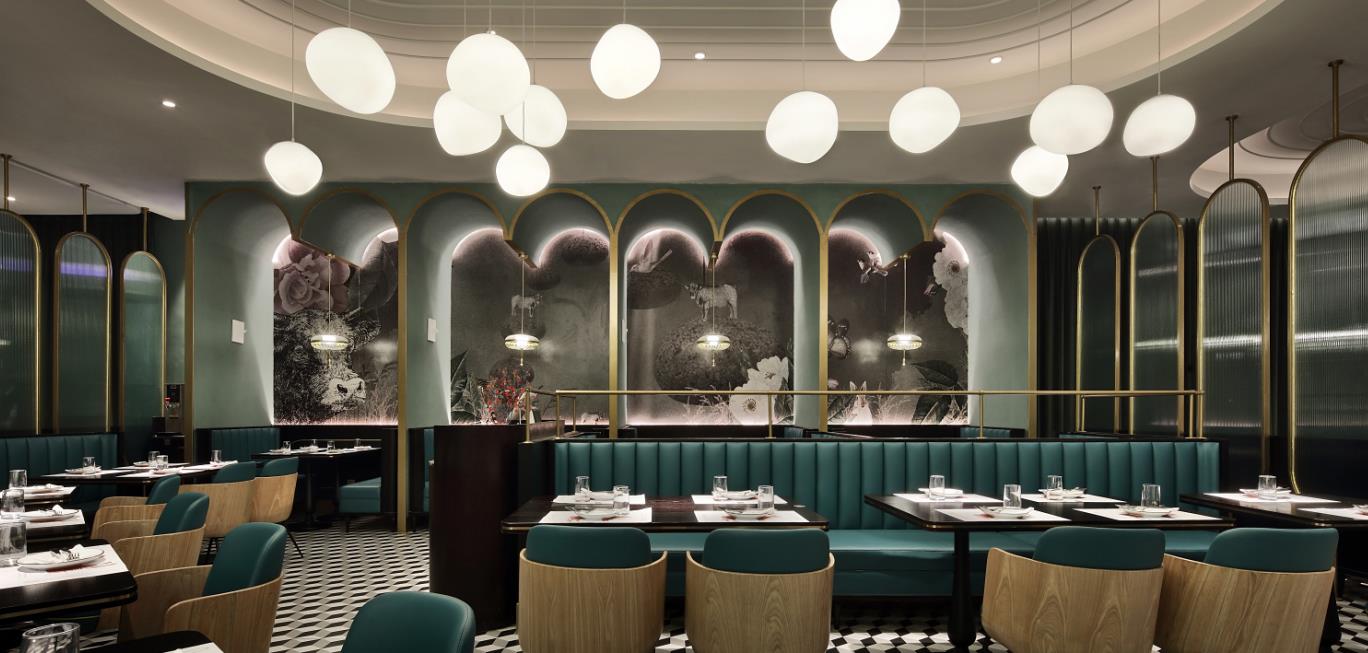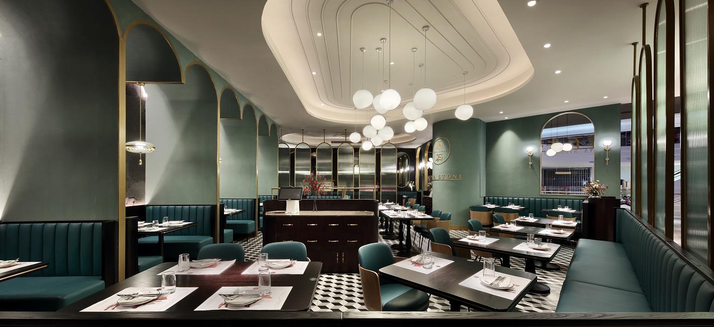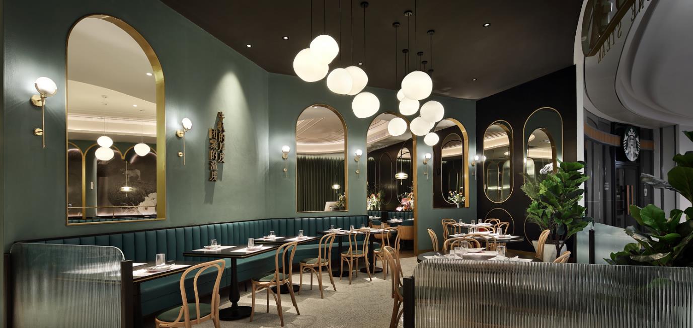 從花園步入餐廳,景色隨地磚的跳躍而變換,空間也漸漸變得精致;鏡面的使用呼應空間,天鵝絨窗簾看上去格調滿滿,錯位屏風賦予空間神秘感和私密性。原石的品牌文化融入空間也很巧妙,天花上的線條衍生自原石品牌圖形;