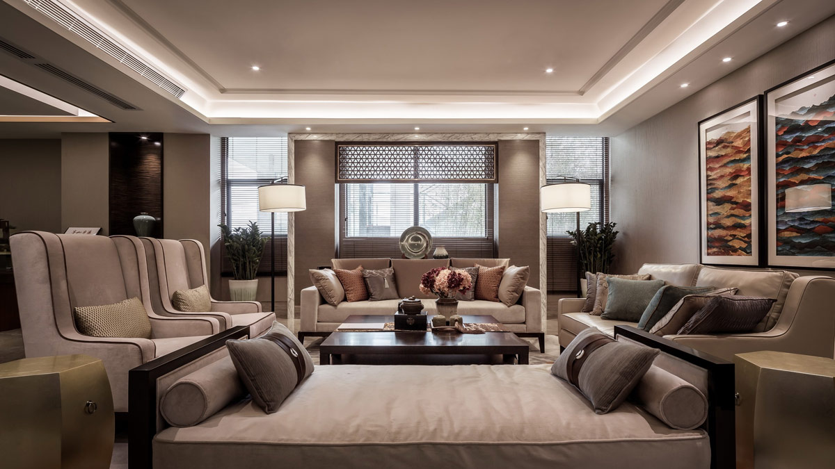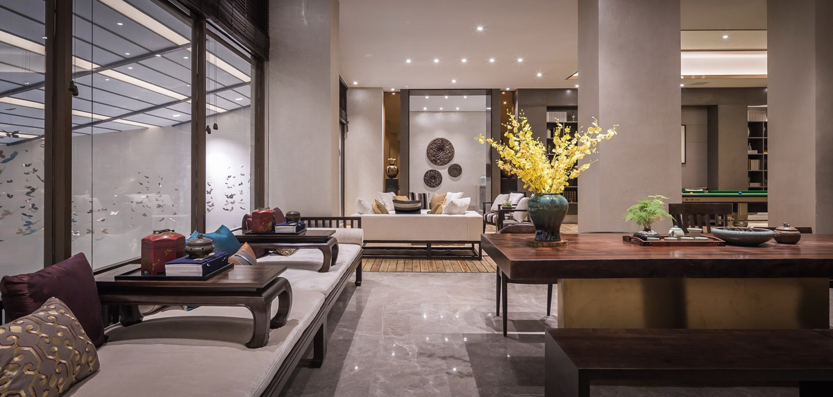 在立面上,設計師用寫意畫的筆觸,輔以深色勾線、淺色帶面,賦予“山”的硬朗。同時,在終飾物料及藝術品中亦融入山水肌理和意向,以“水”之陰柔與其和諧相生。
