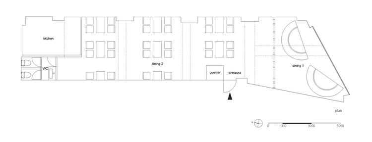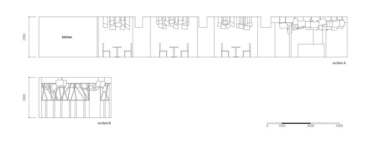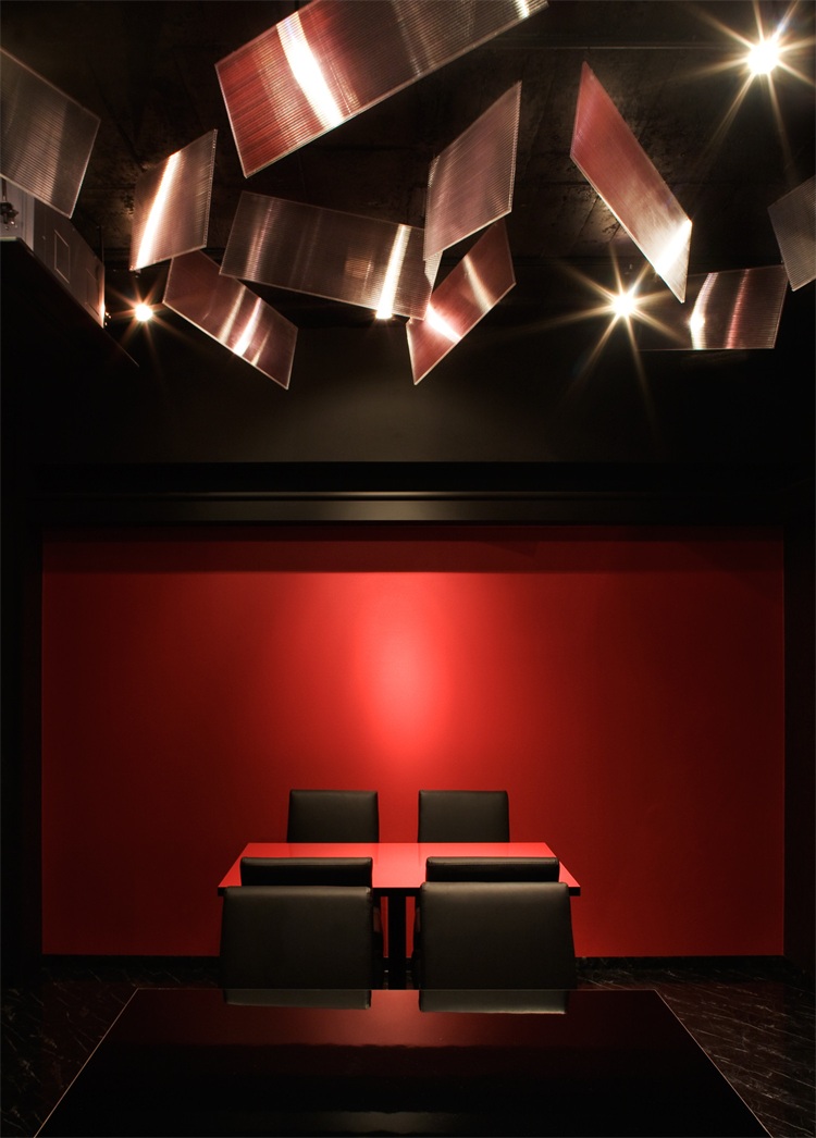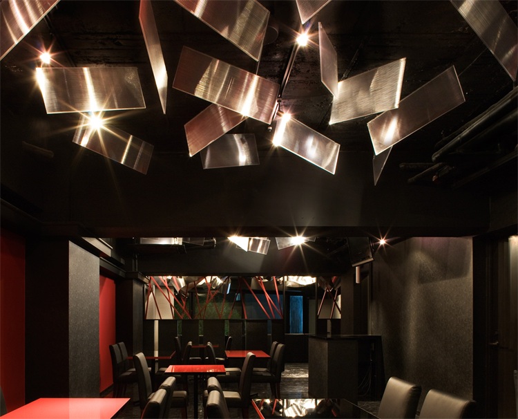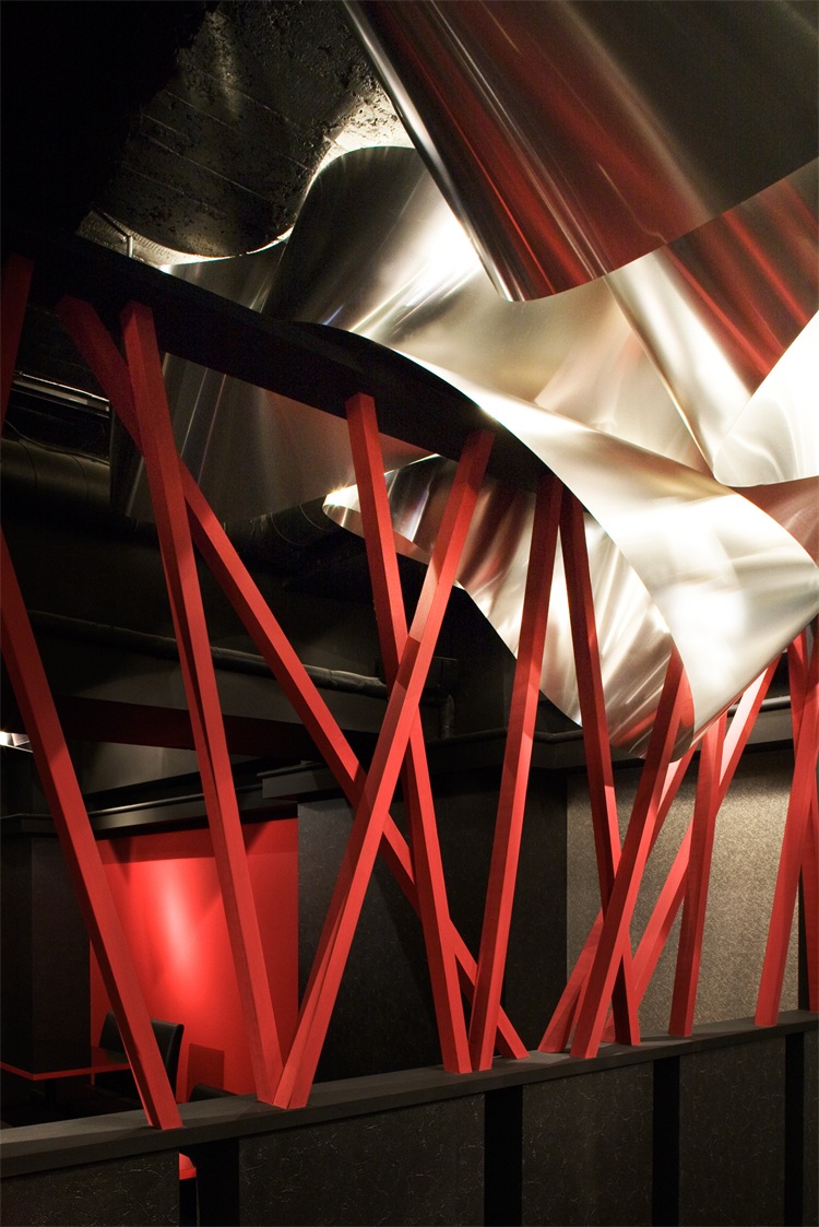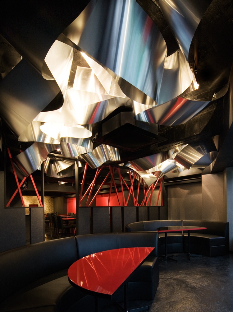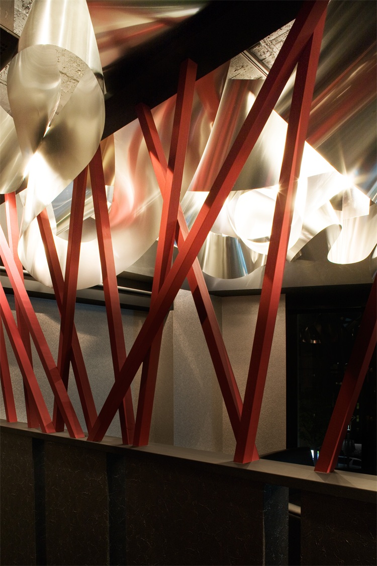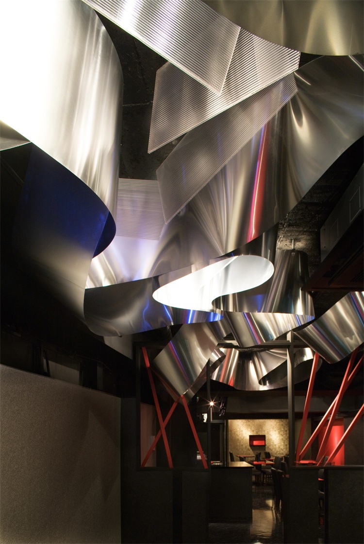 我們進行的這個餐廳/酒吧室內設計是位于一條狹長的洞穴般的環境。動態的脊和溝槽構成了一種發光的滄桑,這些設置巧妙的營造出了一種絢麗的光的空間。若隱若現的光的碎片點綴著旁邊的入口-----就像冰晶或水晶碎片-----所有這些在這個寒冷的冬日給人們營造出一種光的寧靜氛圍。像一個生物在自由翱翔,發光的鋁合金光波在空中旋轉,與在面對大窗戶的紅色木材晶格和后區域相互交織,讓這片空間充滿了一種活躍的運動感。洞穴前后折射的光與其他光的碎片,明亮的鋁和紅色木材晶格互相融合輝映,從而使這個空間形成一種獨特的效果。