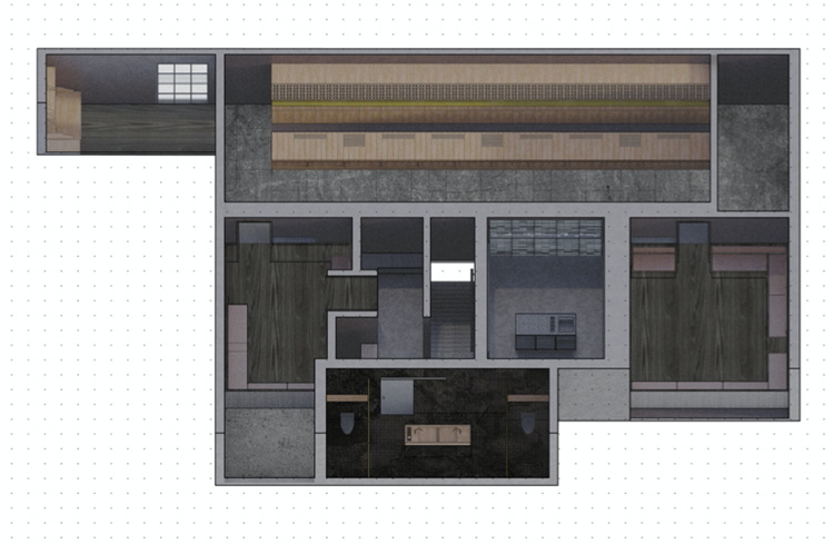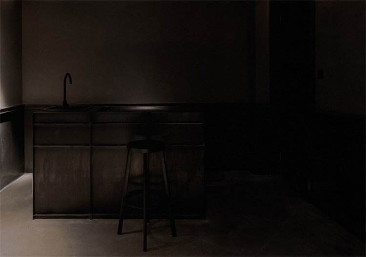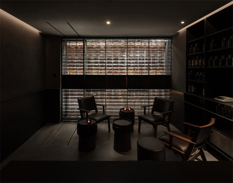 秘密酒吧里最后一個秘密空間是雞尾酒研發室。同樣,密室入口被設計師非常巧妙的隱藏在玻璃磚墻中,需要機關才能被打開。室內使用了大量的黑色實心鐵,用于墻裙、展示柜和中島,地面是深灰色水泥自流平。展示柜上擺滿用于研發分子雞尾酒的設備,有離心機、旋轉蒸餾機、均質機和冷扒機等等。墻上播放著長吧臺的同步影像,以便老板獨自研發雞尾酒的時候,可以隨時掌握外面的動態。