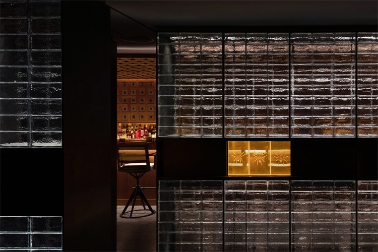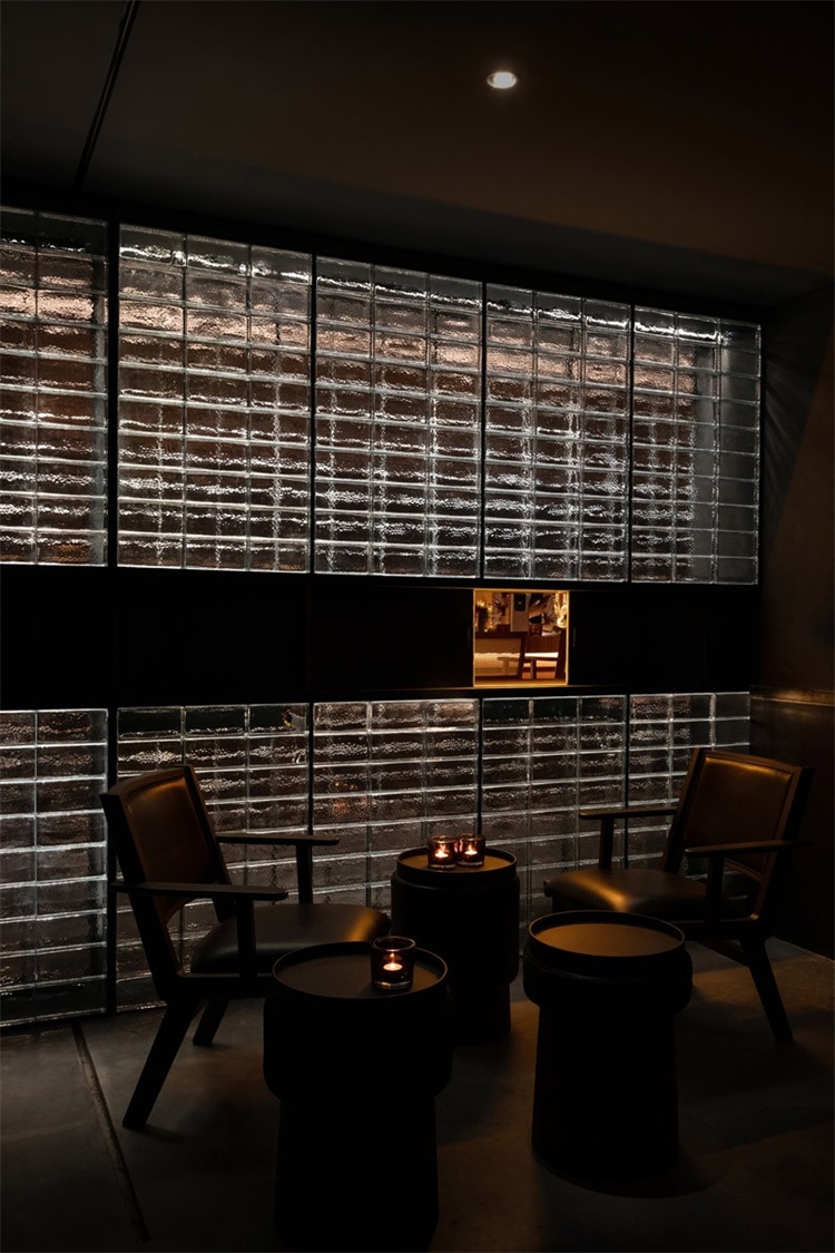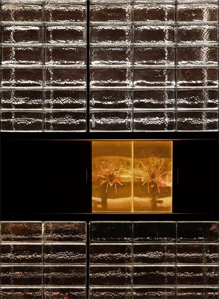 長吧臺對面是一整面玻璃磚墻,將公共區域和其他相對私密的卡座和包間進行了很好的分割,在空間上起到了分割限定的關鍵作用。包間的入口低調地消融在玻璃磚墻上,使之形成整體。實心玻璃磚由5毫米黑色實心鐵分隔組成墻體,玻璃表面呈現手工敲打的圓形凹點,在燈光的照射下折射出豐富而神秘的光。玻璃磚墻正中央鑲嵌了一條由42只巨型泰國捕鳥蛛做成的樹脂琥珀,與對面的甲殼蟲形成一種有趣的呼應。設計師又在玻璃磚墻上嵌入幾個黑鐵抽屜,內部藏著其他稀有漂亮的昆蟲琥珀標本:甲蟲科、蜣螂科、花金龜科和臂金龜科。當客人坐在卡座喝酒時,還可以打開這幾個黑鐵抽屜作為小桌板使用。