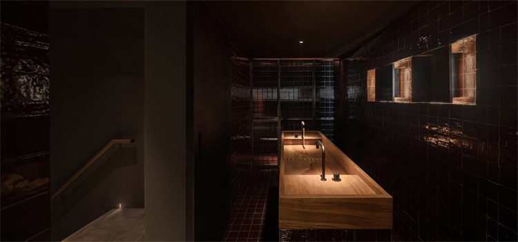 秘密酒吧的衛生間延續了整體的神秘風格,燈光昏暗,墻面和地面是深紅棕色方形手工瓷磚,搭配黑色壓花玻璃。選用盛夏時分蟋蟀和蟲子的叫聲做背景音樂,兩個呼吸燈配合著閃閃爍爍,忽暗忽明。唯一被射燈照亮的是整塊柚木制成的洗手臺,得益于緬甸柚木防腐、防潮、防霉的特性。溫潤的實木臺面搭配黑色水龍頭,在射燈襯托下如同展廳陳列的設計品,洗手也被賦予了獨特的體驗。