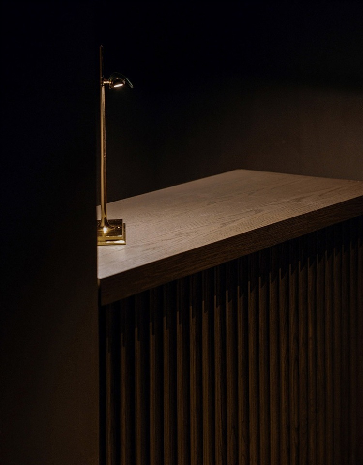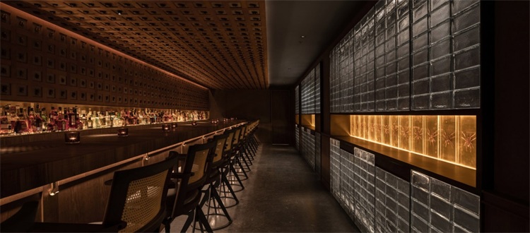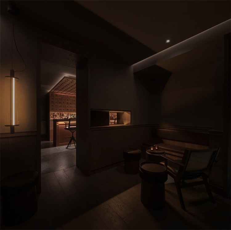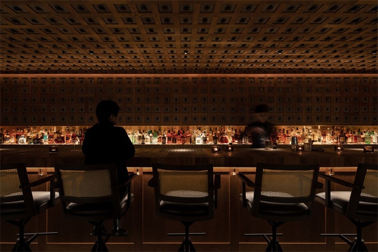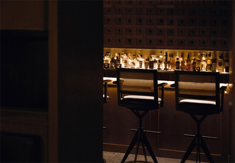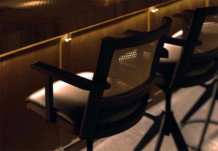 在160平米空間里,長吧臺是絕對的核心。設計師運用了大量溫暖的色調:緬甸柚木,天然牛皮和黃銅等材料。在12米長的緬甸柚木臺面中嵌入3個600x380mm的冰塊托盤,以及6個900x140mm的調酒托盤,可以滿足6-8個調酒師同時工作。吧臺與傳統酒吧的吧臺有許多不同,設計師將所有調酒設備完全隱藏在吧臺下方,避免使用吧臺后面的柜體,保證整個調酒的過程只在吧臺臺面呈現。不僅如此,通過博物館級別射燈的指引,客人可以近距離、沉浸式地觀看調制雞尾酒的全過程。酒保和客人之間因此增加了更有效的交流。溫潤柚木的長吧臺、燈光、酒的香氣以及調酒師的參與,使得整個調酒的氛圍更貼心和私人化。此外,長吧臺區的吧椅也是為這個項目量身設計,選用胡桃木實木、實心鐵做氟碳噴涂搭配印度尼西亞手工編織的六角眼編材料和天然牛皮。