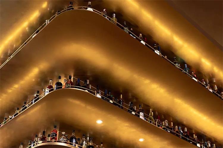 干凈利落的的空間處理手法加上架臺上琳瑯滿目的酒水使得吧臺視覺上有一種空間體驗感。