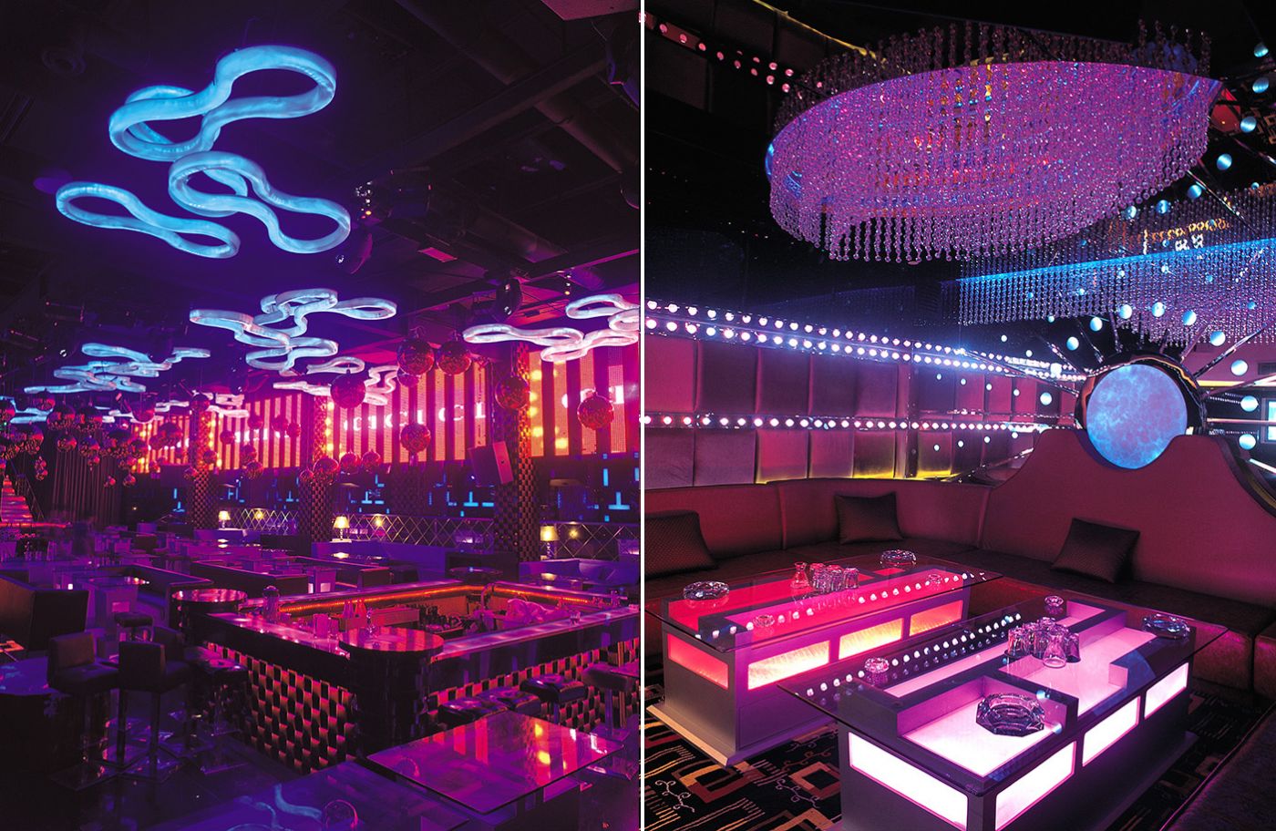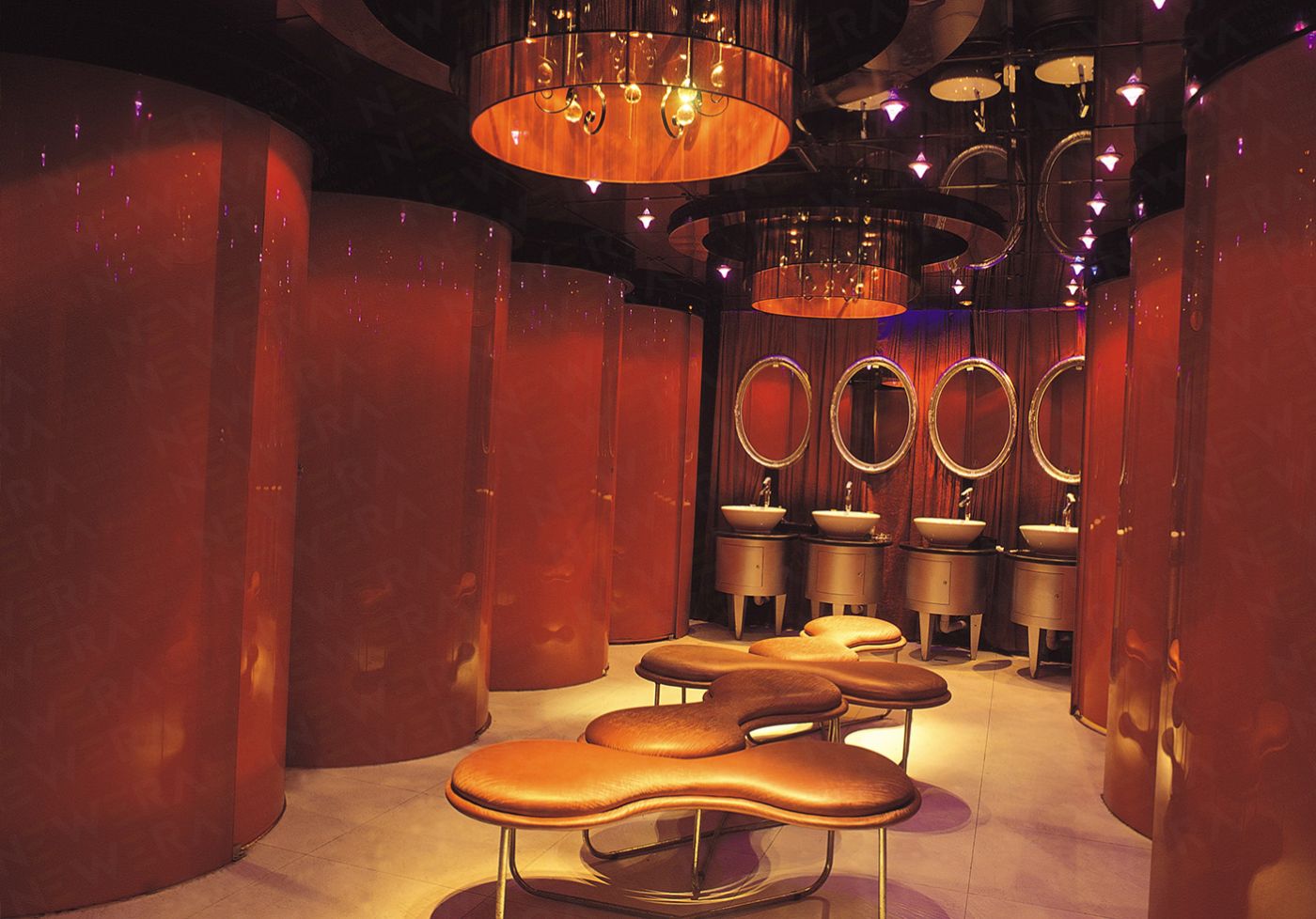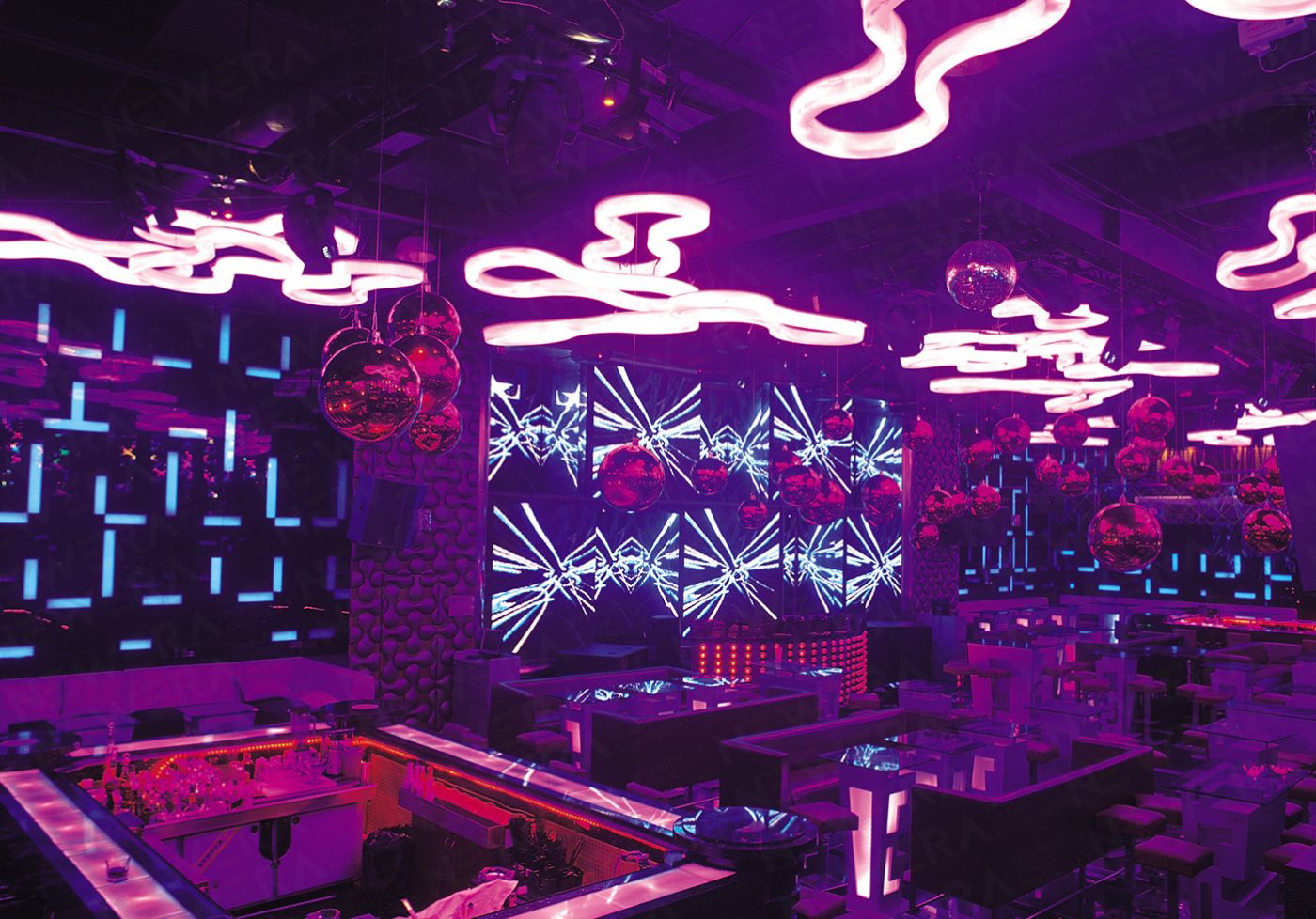 漫步走廊間感受那流光沁影的水晶床與浮華幻彩的點綴,轉入空間廣闊有若仙境的大廳,異次元般空間正中全球首試360度巨大球型激光轉燈,凹凸立體電子顯示屏、LED背景托光主舞臺,自由升降的Dancer Show吧臺,與四周的迥異的卡座布景,呈現出極具視覺沖擊力和特色記憶點。