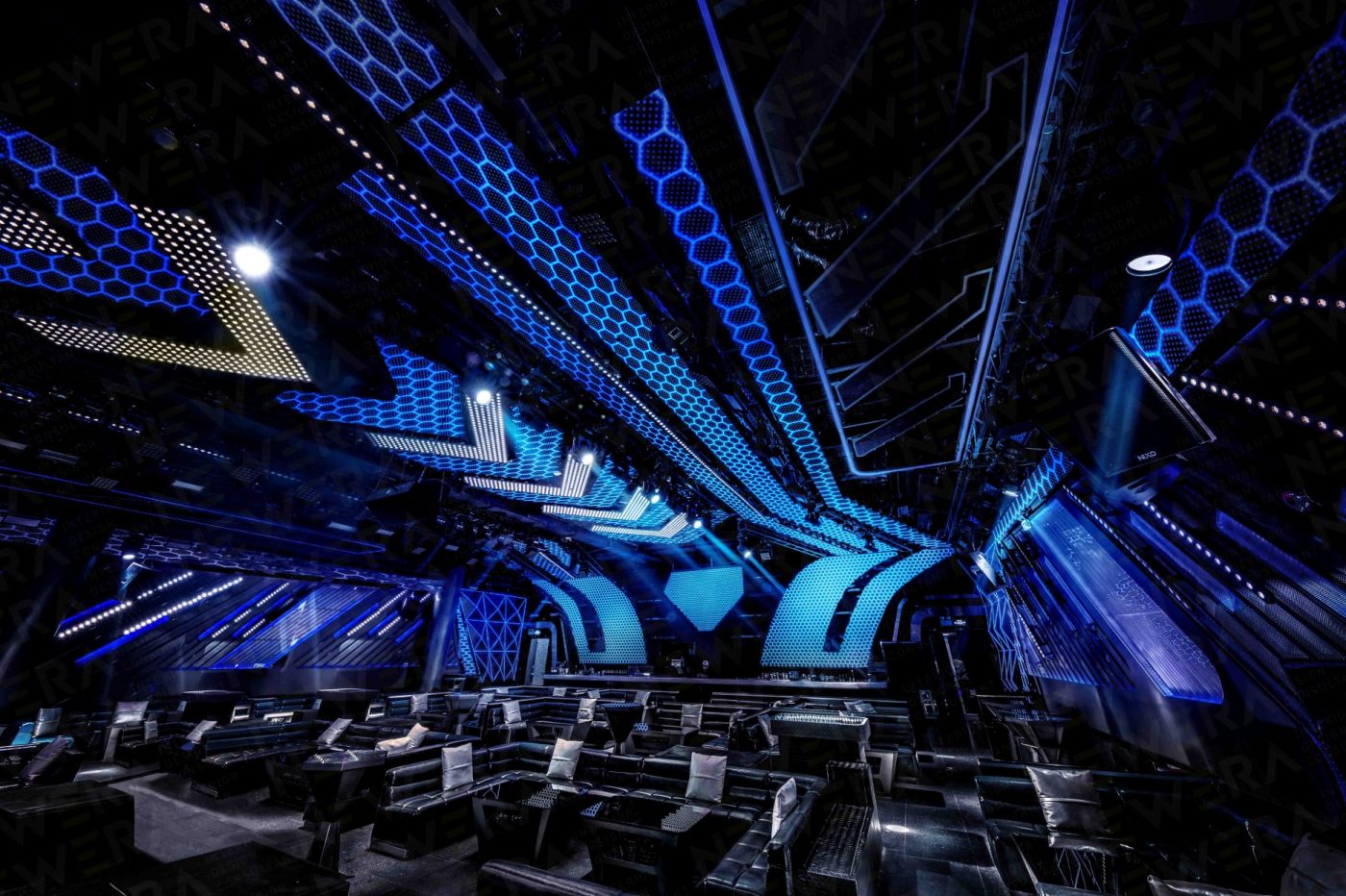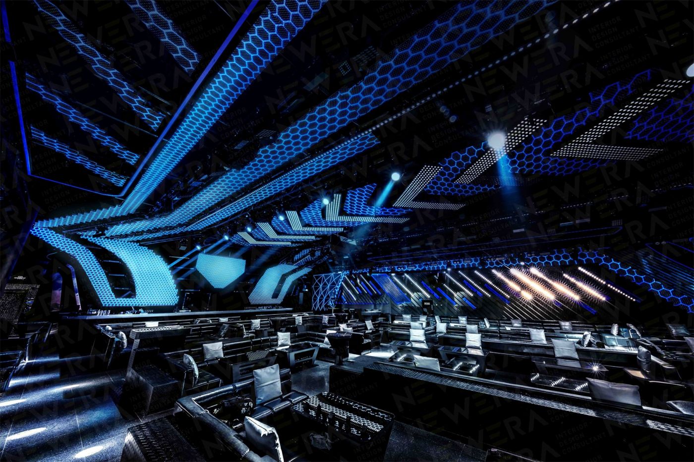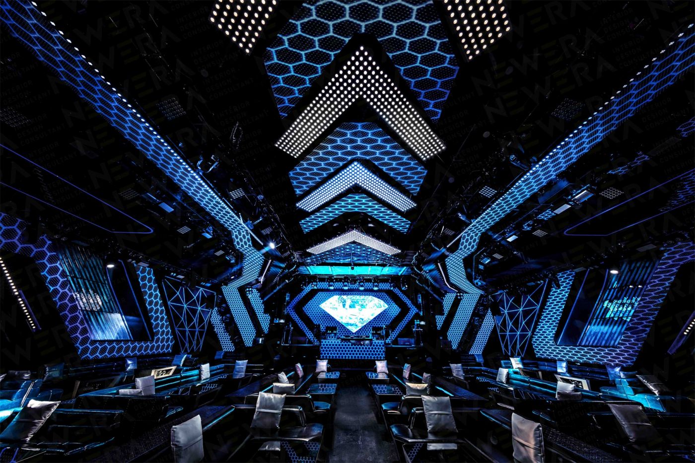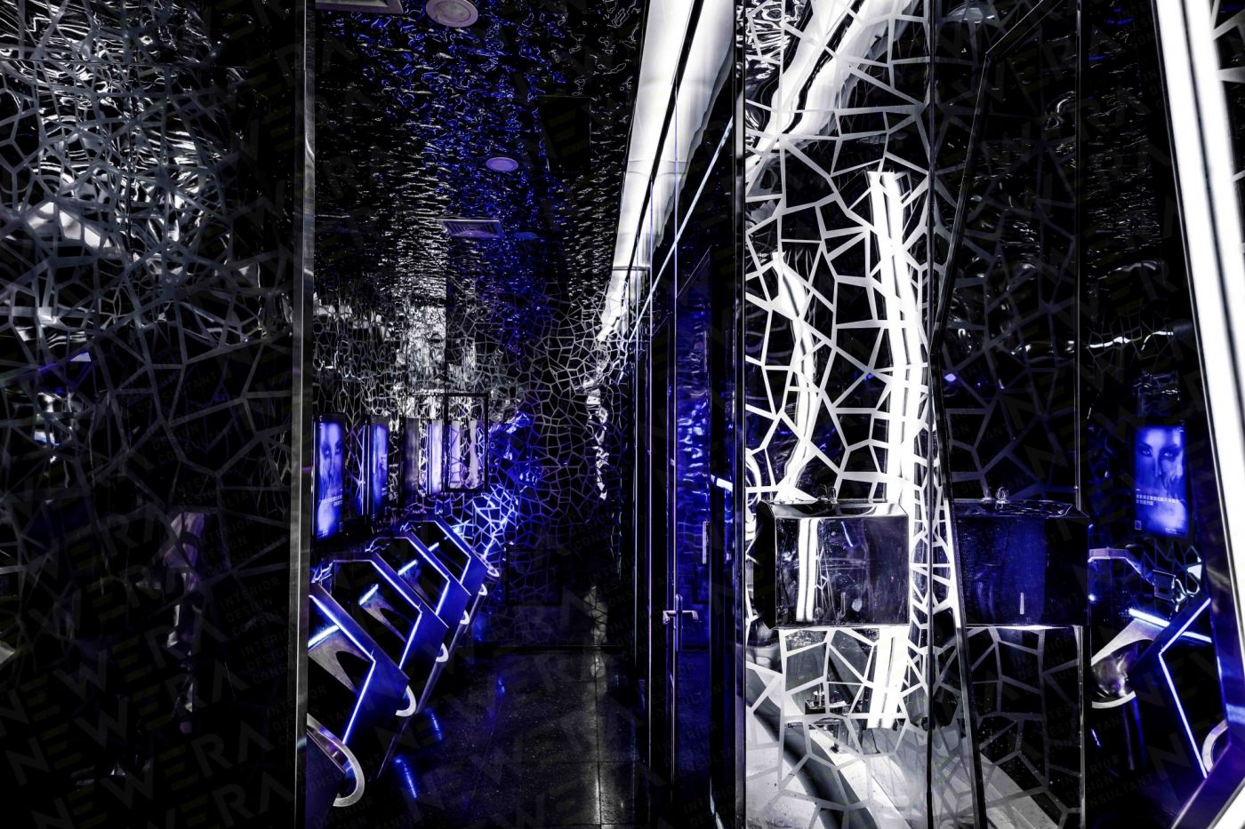 廣州的自由包容,形成了一種獨(dú)有的國際化且多維度的娛樂氛圍。如何在現(xiàn)有的娛樂生態(tài)中突破創(chuàng)新,是貝帝一貫以來的設(shè)計(jì)理念。本案中,新冶意圖打造一個(gè)以鉆石元素為延伸的自由而時(shí)尚的娛樂空間,把鉆石高冷、時(shí)尚、璀璨、恒久的特性融入大眾娛樂中,推出首個(gè)“鉆石“娛樂空間的概念。本案的最大特點(diǎn)是用大量的冷光和線條把鉆石稀缺、高貴的形象和大眾娛樂聯(lián)系到一起,營造整體自由跨界的氛圍。以鉆石為主形象,鉆石“光芒“為線條,把DIAMOND 的墻壁和天花連成一體,多面形墻壁的邊緣用昂貴材質(zhì)包裹,讓人們能感受到置身在“鉆石”的奢華當(dāng)中。