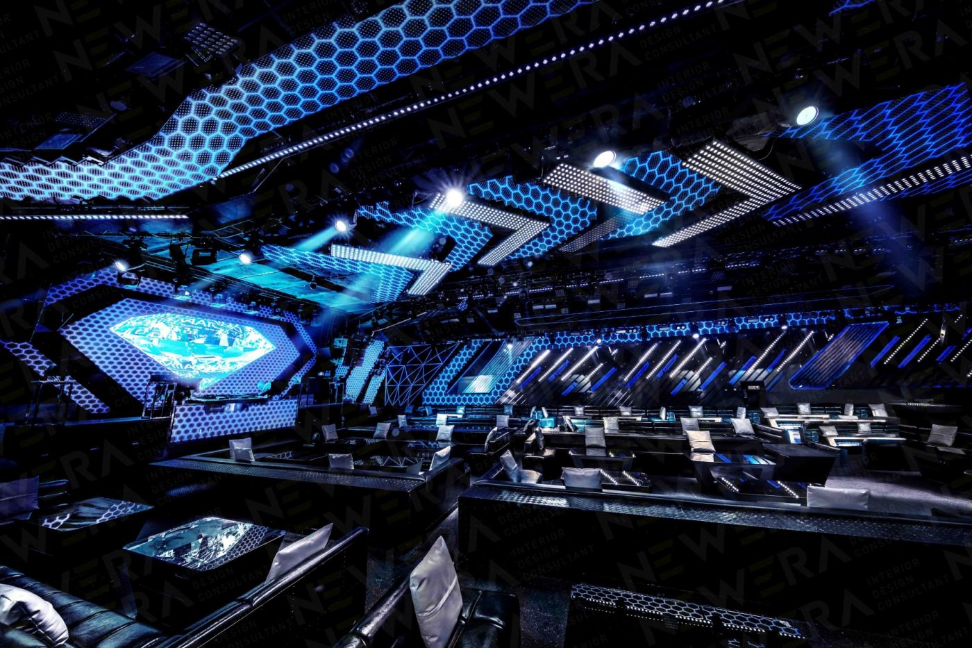 本案的最大特點(diǎn)是用大量的冷光和線條把鉆石稀缺、高貴的形象和大眾娛樂聯(lián)系到一起,營造整體自由跨界的氛圍。以鉆石為主形象,鉆石“光芒“為線條,把DIAMOND 的墻壁和天花連成一體,多面形墻壁的邊緣用昂貴材質(zhì)包裹,讓人們能感受到置身在“鉆石”的奢華當(dāng)中。