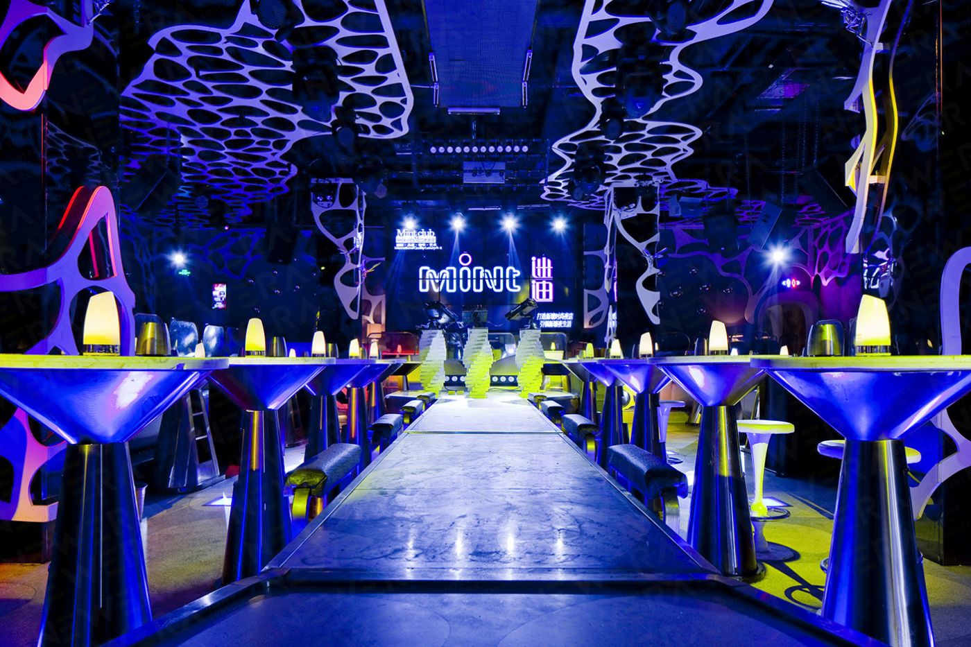 大廳中的散臺與卡座依次排開,但是更吸引人的是充斥著整個空間的不規(guī)則幾何圖形,在光影的營造下,既滿足了空間造型的需要,也滿足了功能的需要。
