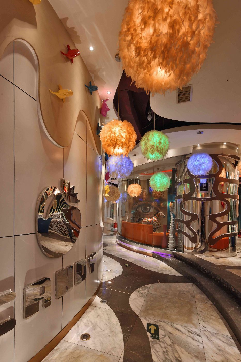 在大門處,繡球般的吊燈與花鳥蟲魚的情境造型與墻面上的彩繪相得益彰,光怪陸離,好似進入了一個童話般的世界。