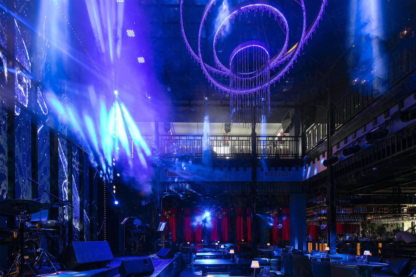 本次電音酒吧設(shè)計(jì)方案分為上下兩層,設(shè)計(jì)師通過(guò)簡(jiǎn)化傳統(tǒng)榫卯的復(fù)雜結(jié)構(gòu)及鐵藝的尺度把控,將中式“樓閣”文化講究的休閑、自由、舒適發(fā)揮到極致。纖細(xì)而優(yōu)雅的鐵藝立柱、護(hù)欄、玻璃架傳遞出蘇州特有的細(xì)膩,而相對(duì)粗獷的墻面材質(zhì)運(yùn)用在增強(qiáng)空間視覺(jué)沖擊力同時(shí)也更好的解決了回聲問(wèn)題,給予客人縱享音樂(lè)與味蕾享受之余感受MOJO設(shè)計(jì)的人文與巧思,無(wú)限激活了空間能量。